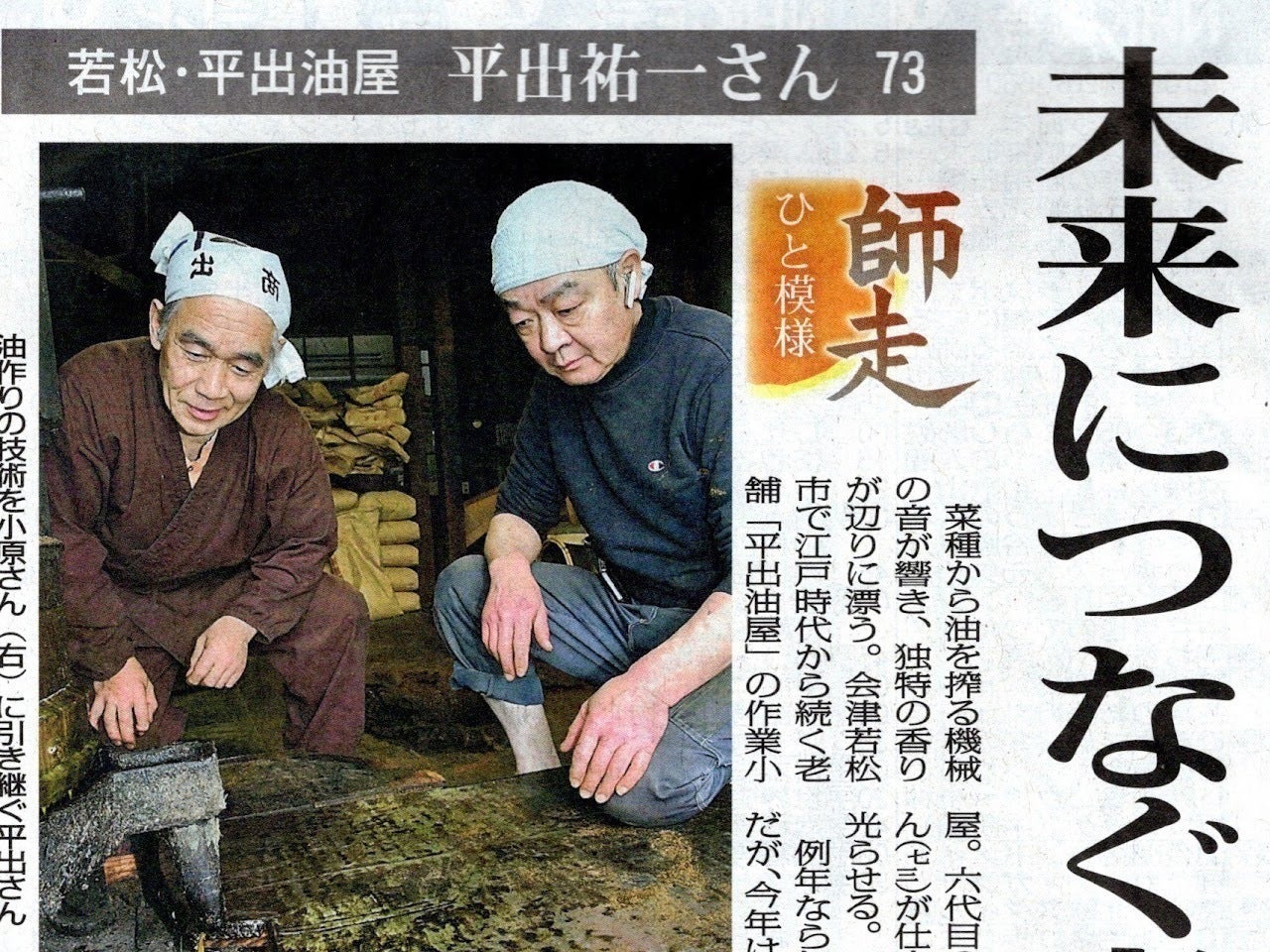 応援しています!頑張ってください!伝統の技を守ってくださり、ありがとうございます。若い人にも繋がっていくこともとても嬉しいです。平出さんの胡麻油をいただくのを楽しみにしています。喜多方へ行った時には、おはら豆腐店にも寄らせていただきます。ご尽力ありがとうございます。