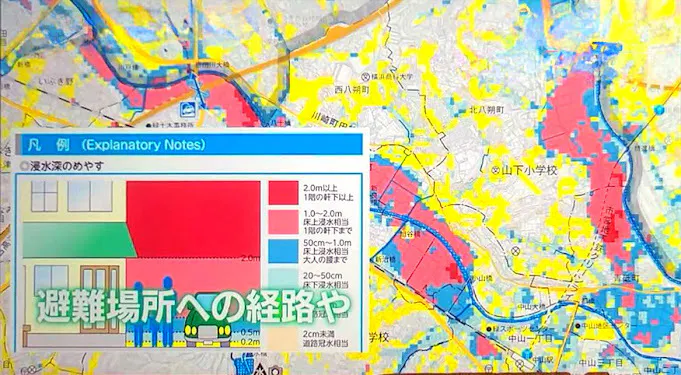 内水氾濫で既に道路は、川のようになっており水深30㎝でも避難所に、辿り着けず避難は困難。また浸水軒数は、内水氾濫が60%以上で都心部ほど多い。