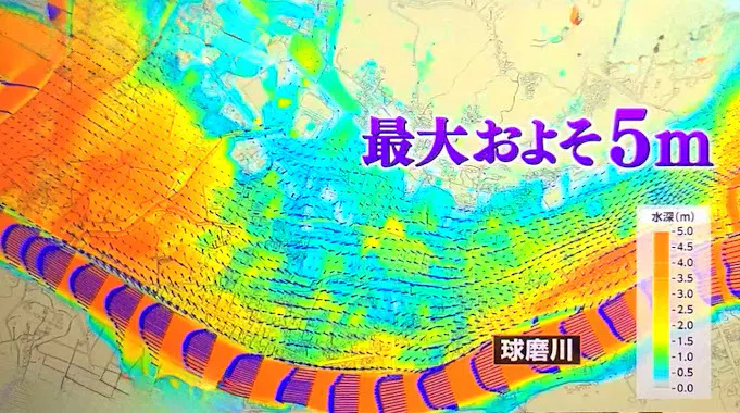 (2020年7月熊本県人吉市の場合は、20人犠牲。午後4時。内水氾濫避難指示出るも、水深1M.流速60㎝/s。特に高齢者は歩行不可能)