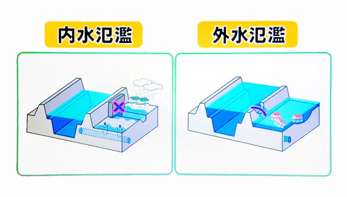 その中でも過去80%は、床下浸水の被害です。内水氾濫をいかにして防ぐかが、今後の重大な問題です。堤防のある側は、外。市街地側は、内。 で、大雨が降って川が氾濫して堤防から市街地に泥水が流れ出す事が、外水氾濫。