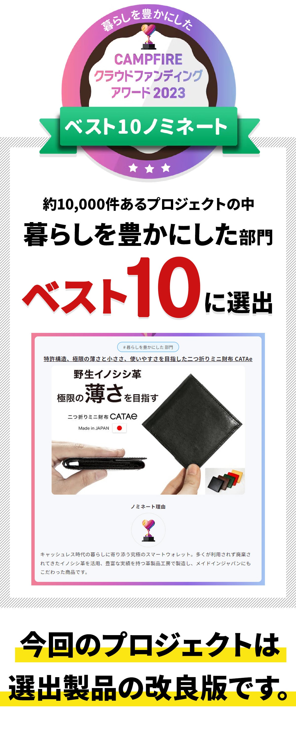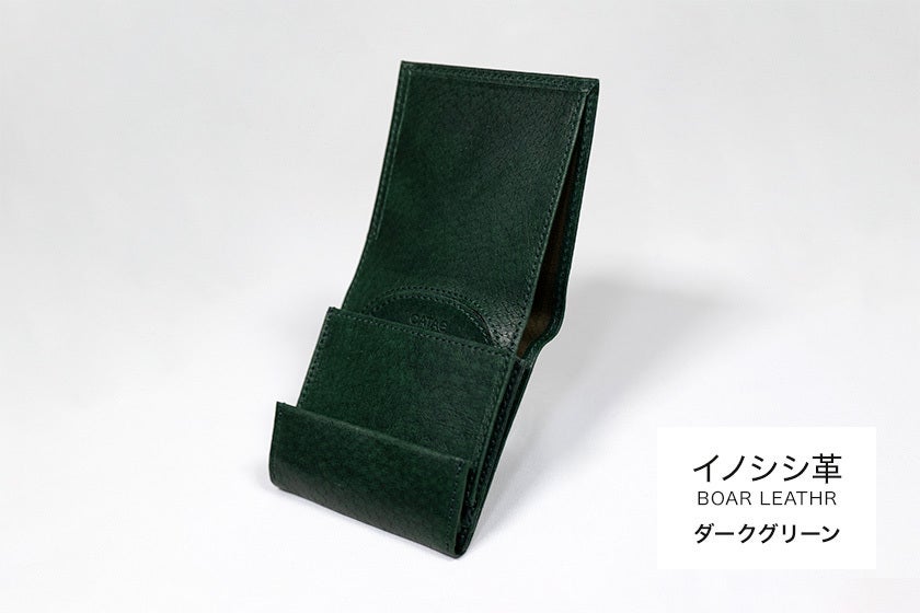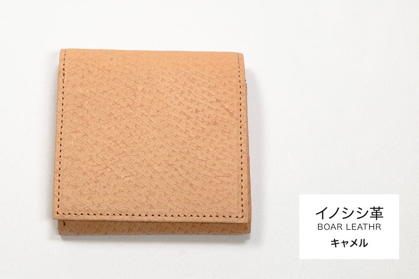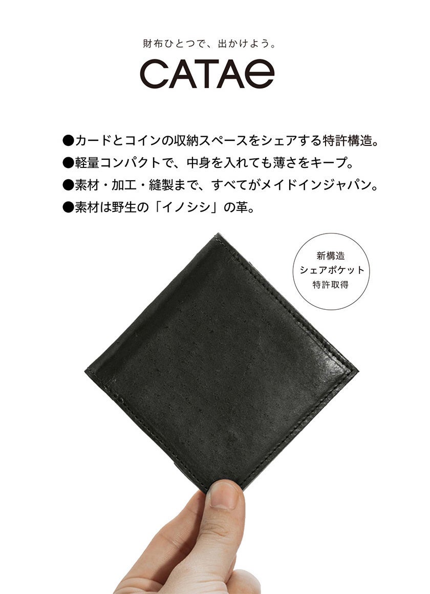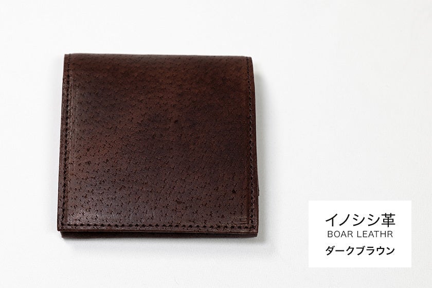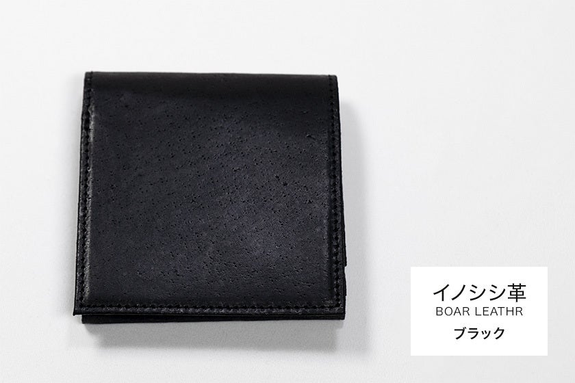 「財布一つで出掛けよう」をコンセプトに開発、職人が一つ一つ丁寧につくる小さくて薄い革財布です。(日本製)キャッシュレス化で多様化した社会に適応する新構造『シェアポケット(特許取得)』を考案し、カードと小銭の収納スペースを変化させ、小銭が多い人も、カードが多い人も柔軟に使用できる財布です。日本の野生イノシシ革を使用しています。