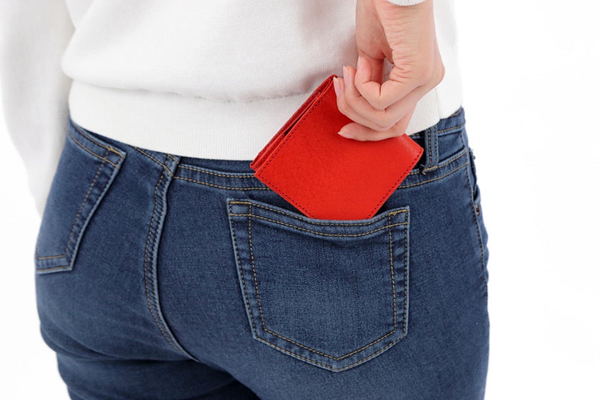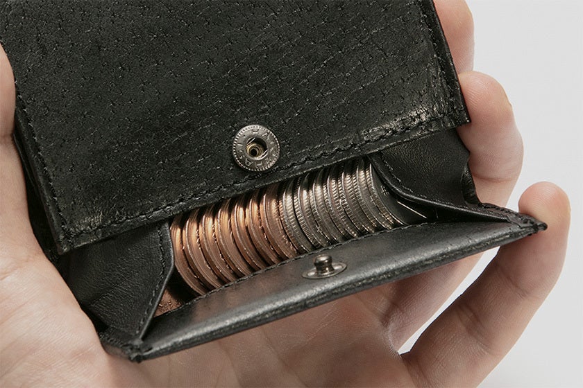 余分なスペースを徹底的に削ぎ落してデザイン。パンツのポケットにもすっきり収まる約9cm角のサイズです。コシの強い芯材入りの構造は、小銭が増えても膨らみにくく、薄さをキープします。