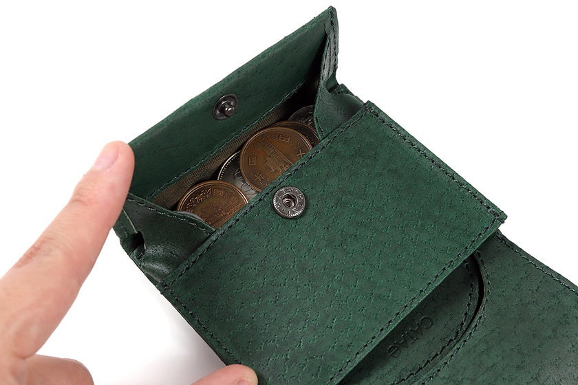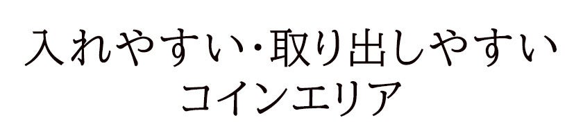 コインエリアは、取り出し口が広いデザイン。見つけやすく、取り出しやすい、計算された構造です。フラップが受け皿になるので、立てたまま使ってもコインがこぼれ落ちません。