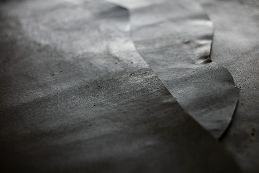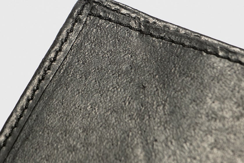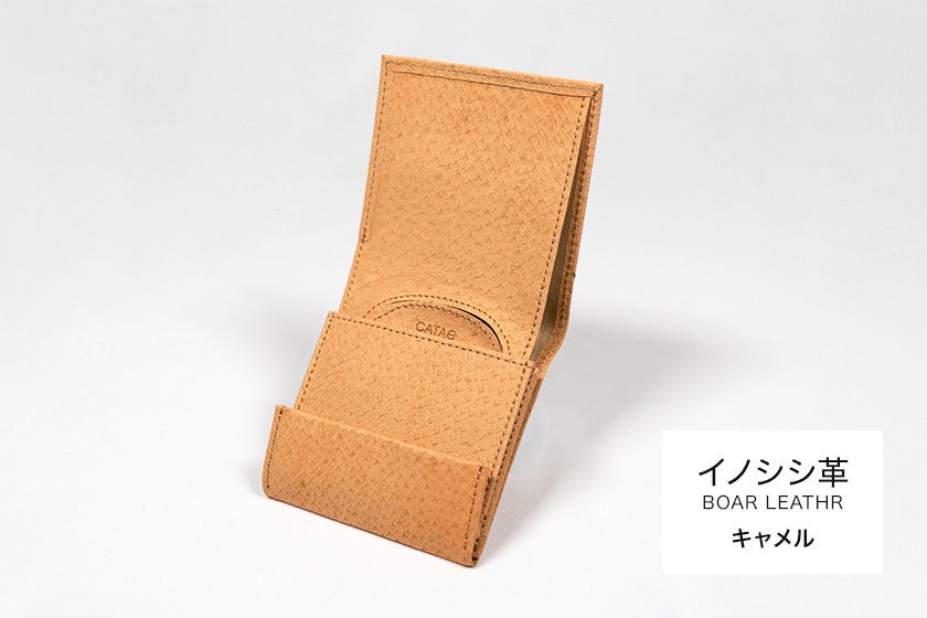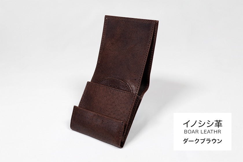 素材には、日本の野生イノシシからとれた革を使っています。近年、イノシシの農業被害が問題となり、毎年60万頭が害獣として駆除されています。本来イノシシ革は耐水や耐摩擦性に優れ、牛革よりも軽量でキズに強いため多くのマタギに愛用されている革です。人の手の油分がオイル代わりになるのでメンテナンス不要です。ジビエ革とも呼ばれ、野性味のある独特の風合いが魅力。しかし、革の加工に手間とコストがかかるため、その多くが利用されず廃棄されてきました。「命を無駄にしない」というメッセージを込めて、特殊な方法で鞣し、財布の素材として利用しています。