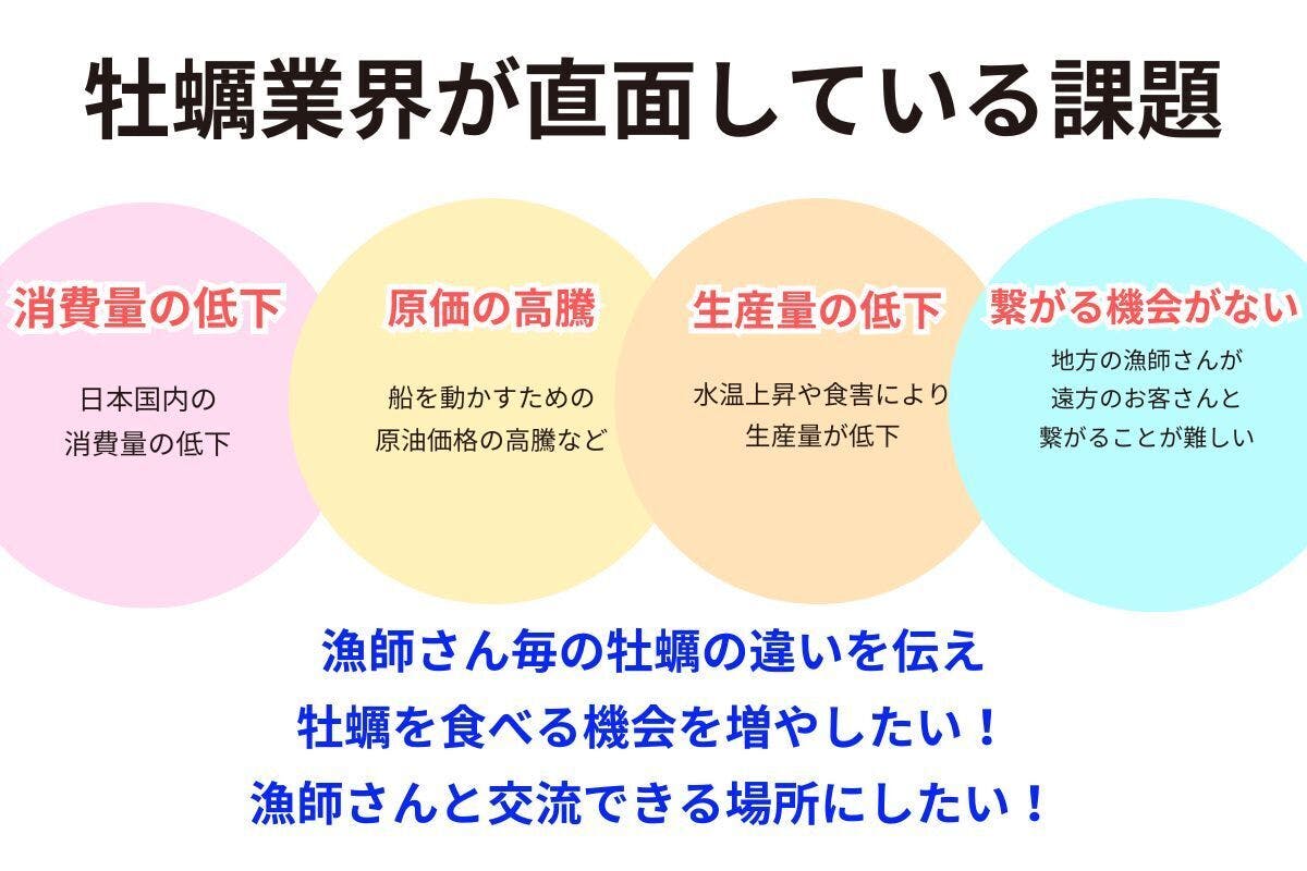 しかし、今のままでは資金面で活動の継続が難しく、牡蠣の魅力を伝えるための新しい取り組みに挑戦する事が難しい状況です。そこで、今回クラウドファンディングに挑戦することを決意しました。