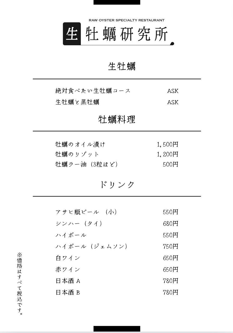 生牡蠣研究所のメニュー(予定)