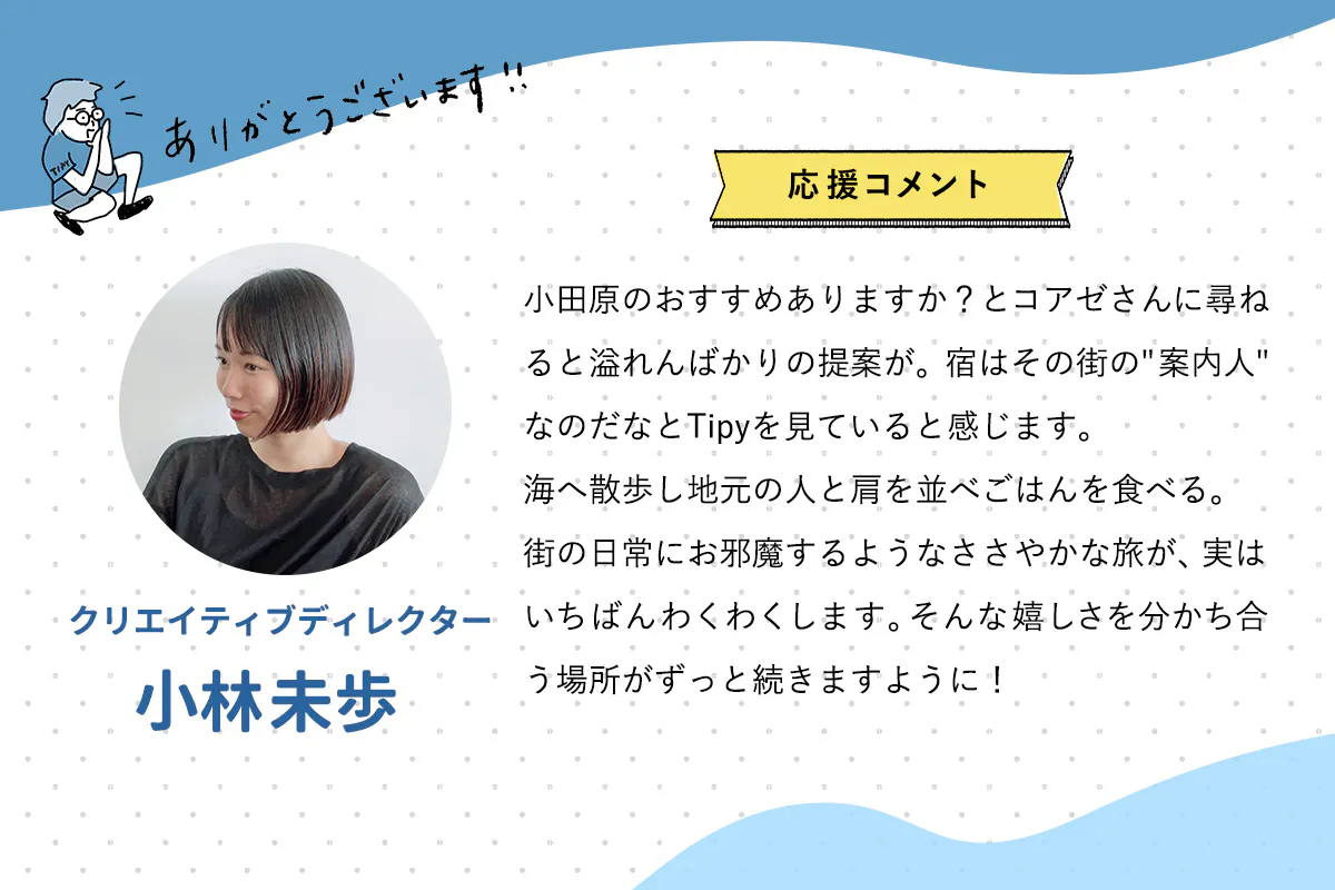 今回のクラウドファンディングでは今までティピーがお世話になった方々に応援コメントをいただきました!一人一人紹介していこうと思います。