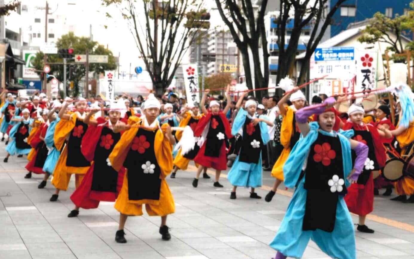 午前 稚児行列 かわいい衣装を身にまとった子ども達が天満宮を出発し約1kmを30分ほどかけて歩きます。