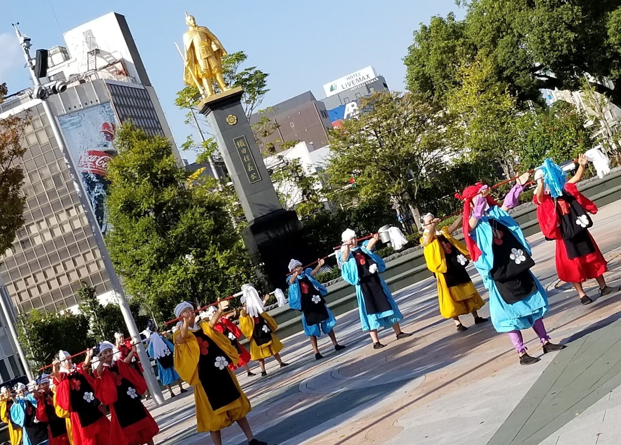 JR岐阜駅では大勢の観客に見守られ華やかな衣装と軽快なステップで舞踏を披露します。
