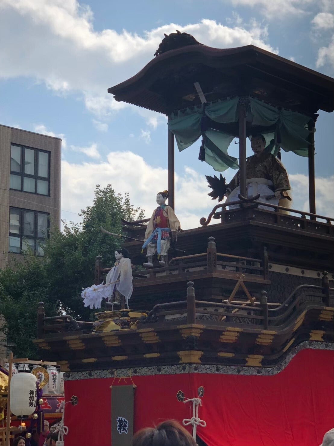 祭り1日目の午前中、山車部会の多くの有志により天満宮を出発。その高さから途中の電線や木々の垂れ下がる枝などに注意を払いつつJR岐阜駅へと向かいます。掛け声に合わせてその巨大な山車が転回する様は圧巻です。