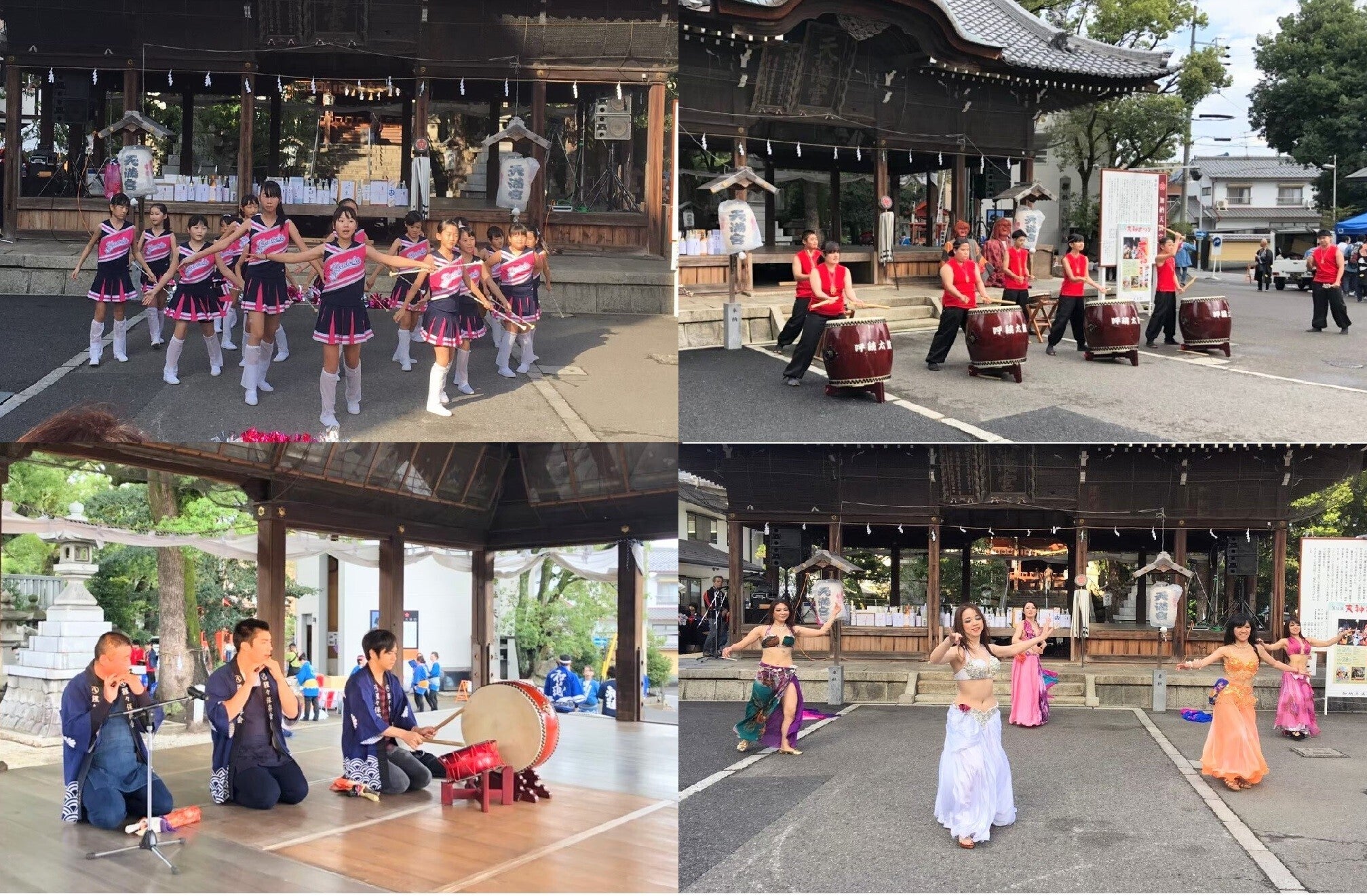 祭り期間は境内において様々な出し物が開催されます。地元の小学生によるチアリーディング、ふるさと太鼓、ベリーダンスなどなど。毎年多くの団体がともに祭りを盛り上げてくれます。