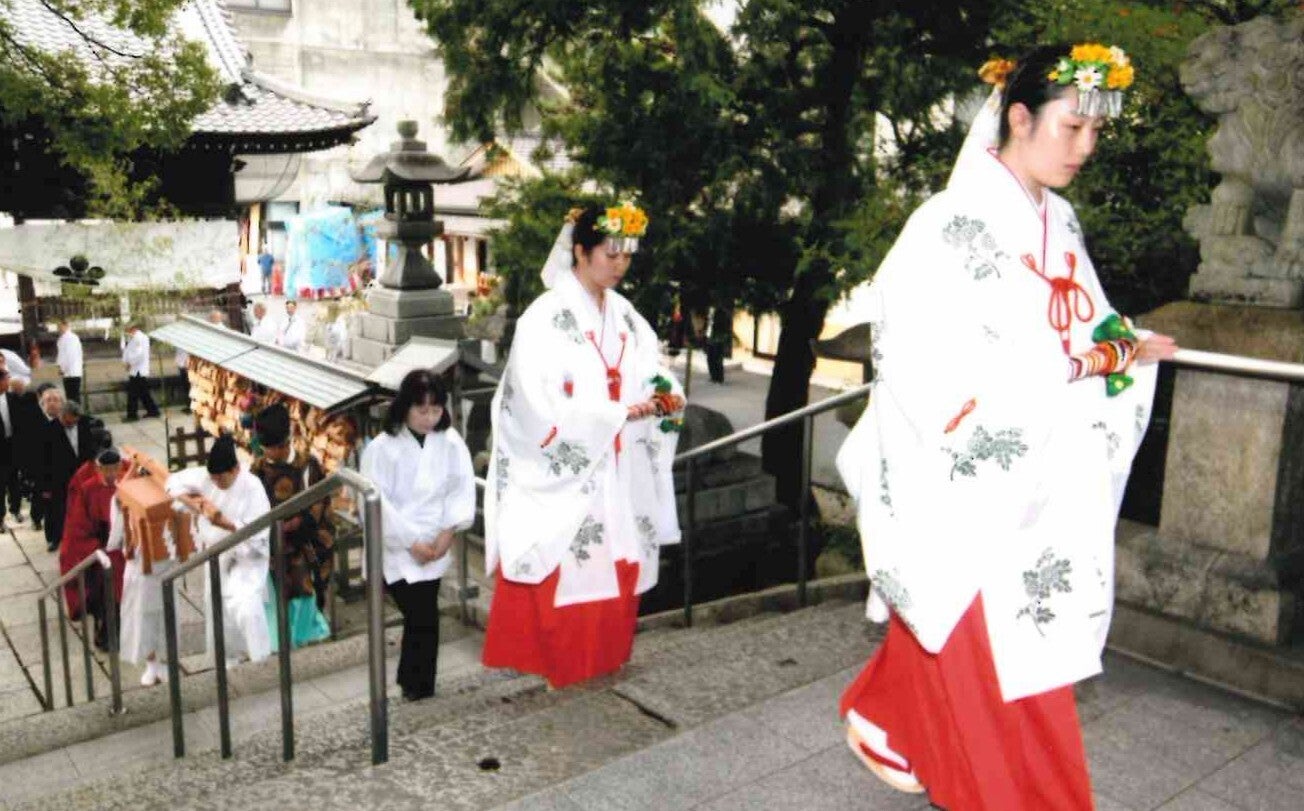 本殿へ向かう献幣使(けんぺいし)、宮司、巫女。