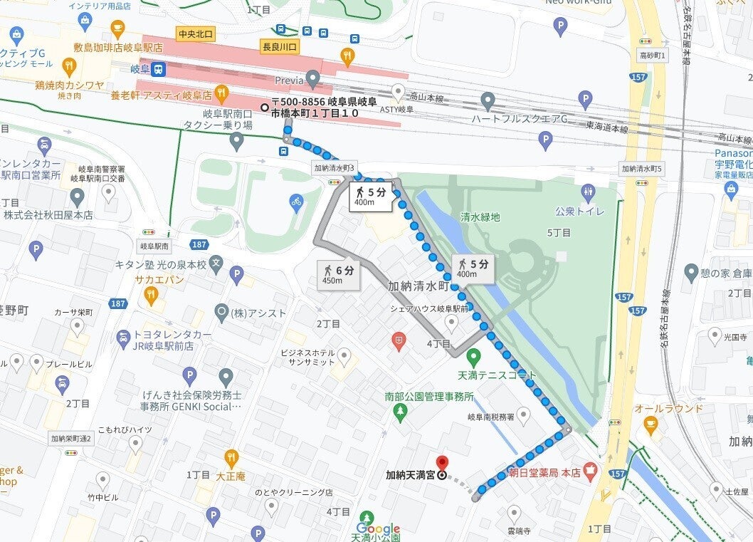 加納天満宮はJR岐阜駅から南東へ400m、徒歩5分の距離です。