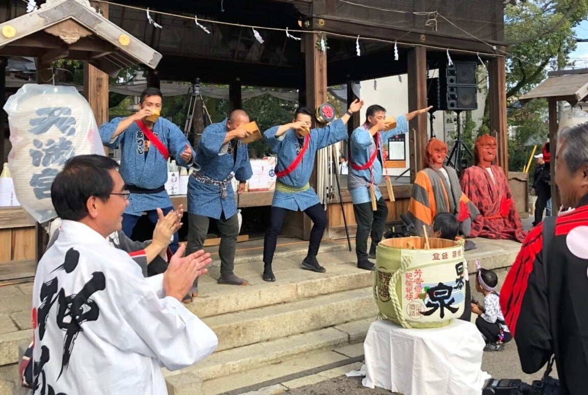 神地元酒造会社協賛のたる酒で鏡割り&威勢のいい掛け声が響きます