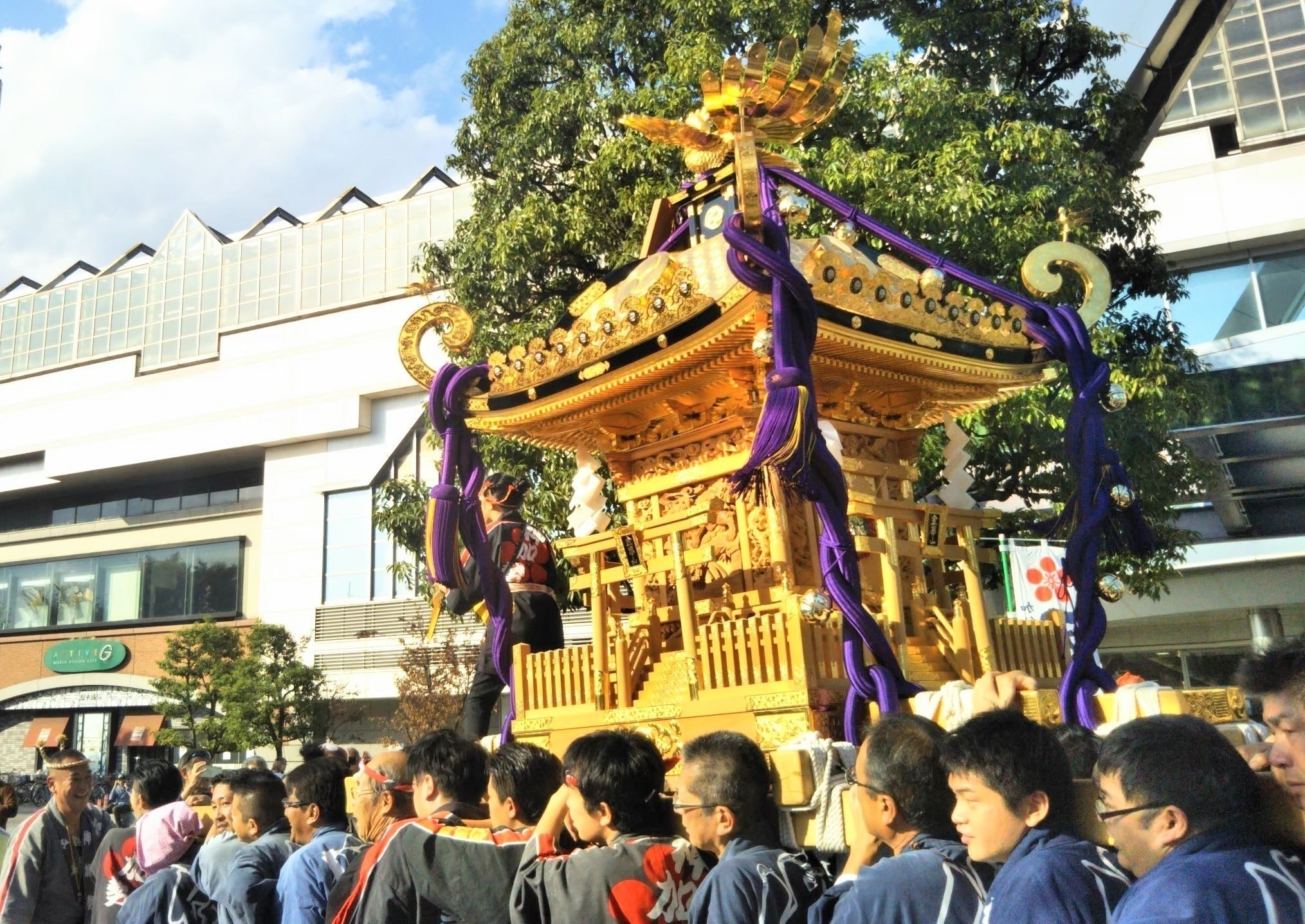 加納天満宮の神輿「金華山」。総金箔が施された八尺二寸(約2500mm)の高さを誇る巨大な神輿は神輿会「神加勢(かみかぜ)」を中心に交代要員含め100人以上で担ぎ上げます。