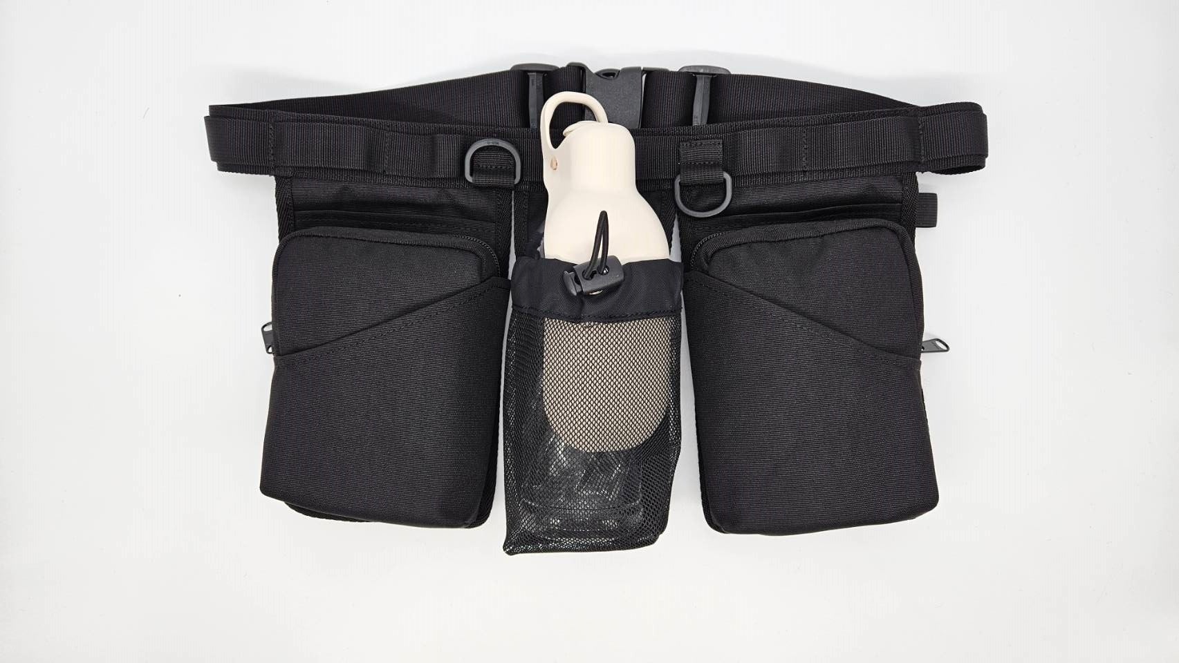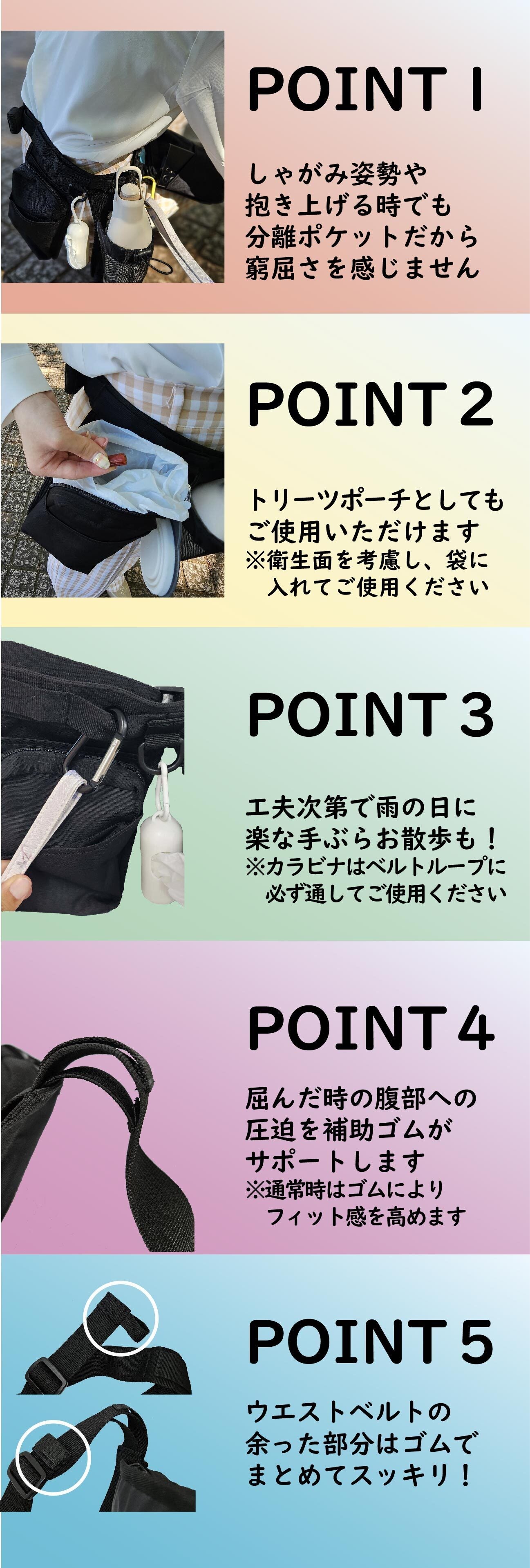 3つの独立したポケットを備えており、着用時の圧迫感を軽減します。一体型の製品では動きにくさを感じることがありますが、各ポケットが動きに合わせて独立して動くため、ウエストベルト内側の伸縮性のある補助ゴムと合わせて、快適な使用感を提供します。また、左右対称の構造であるため、どちらの手でも使いやすく、単なるバッグとしてだけでなく、トリーツポーチとしても活用できます。※使用時は必ず袋などに入れてください。