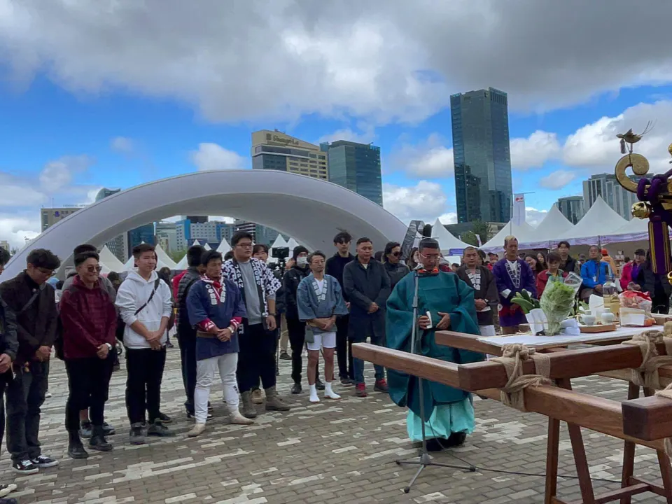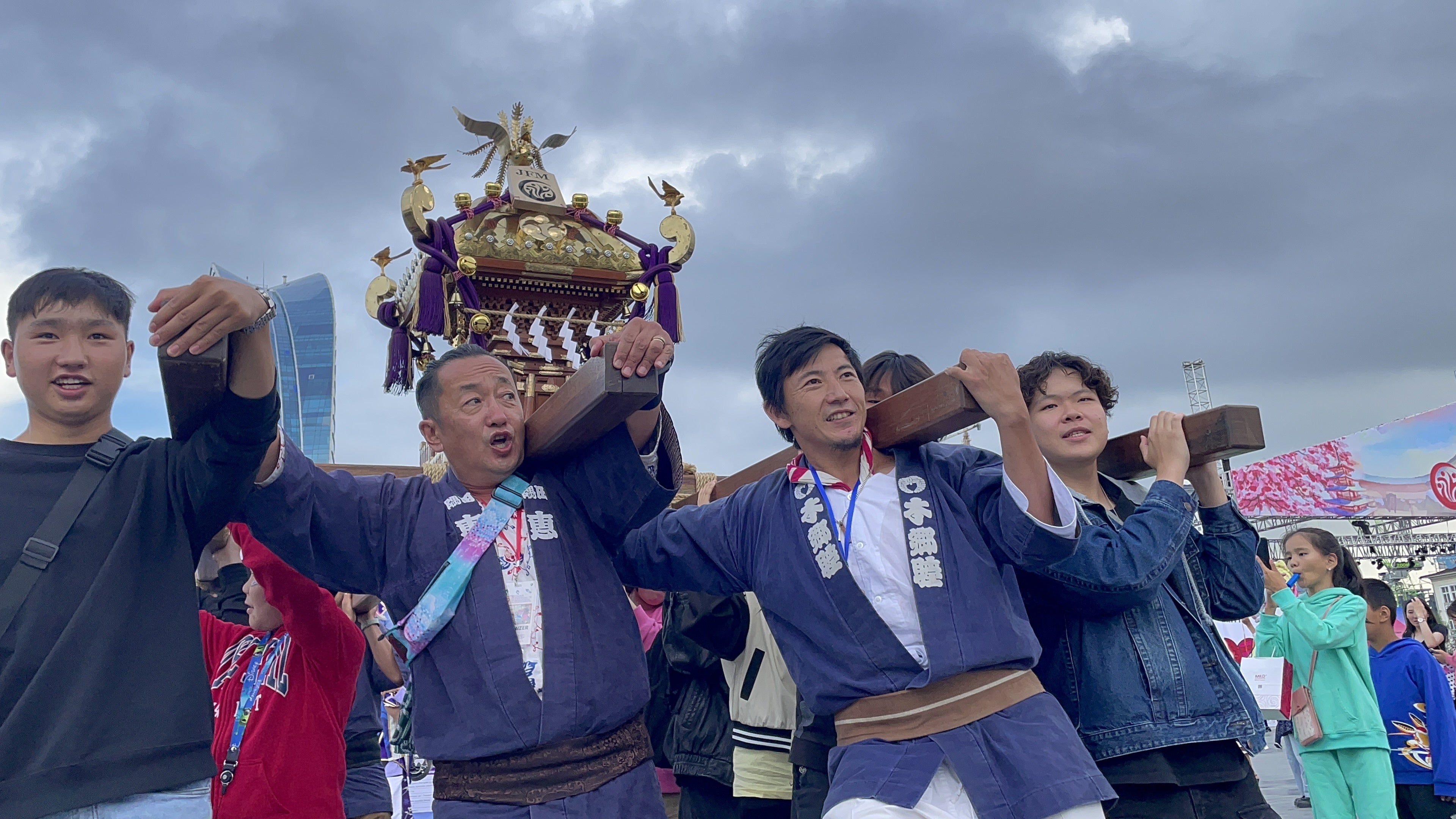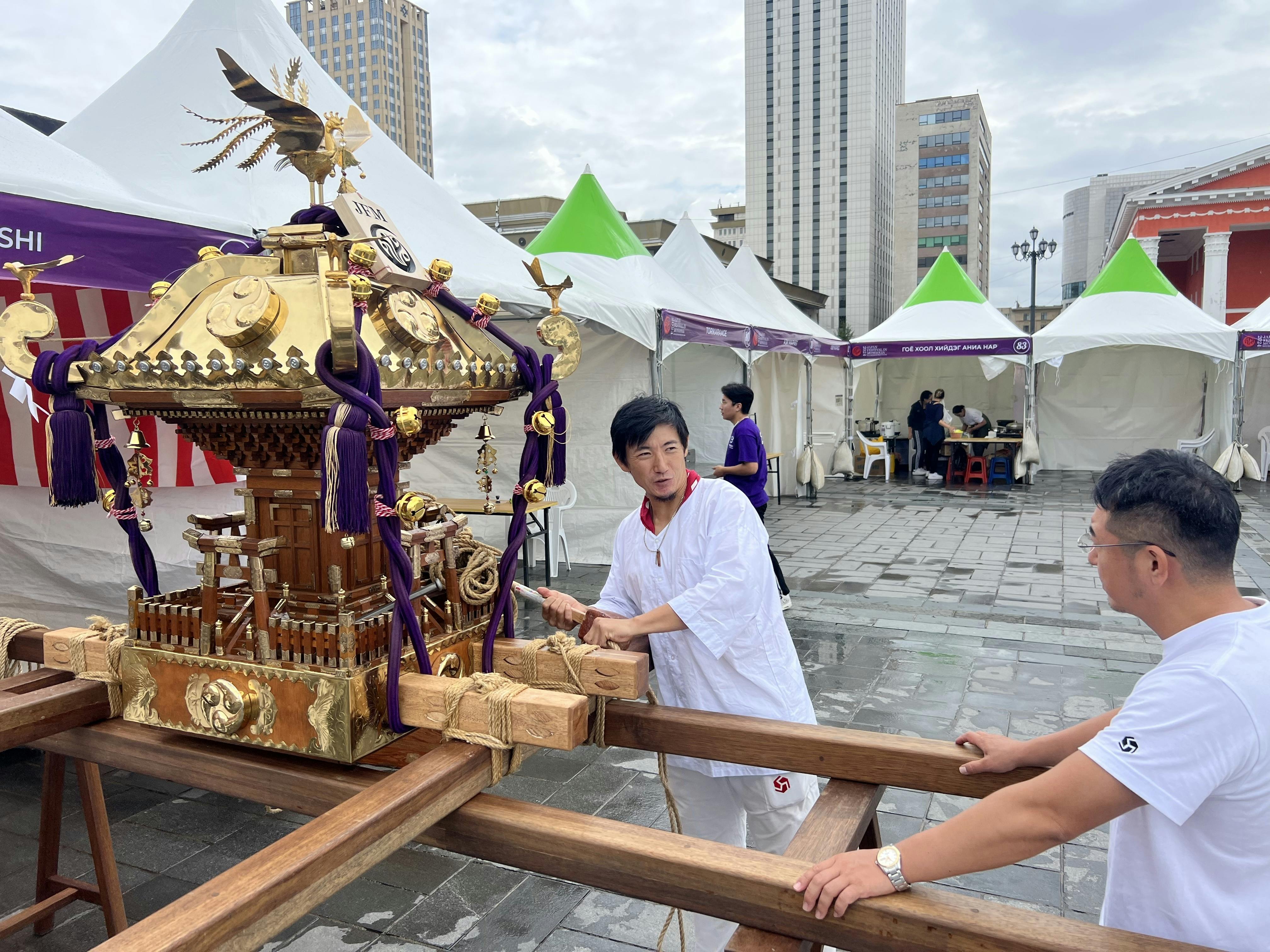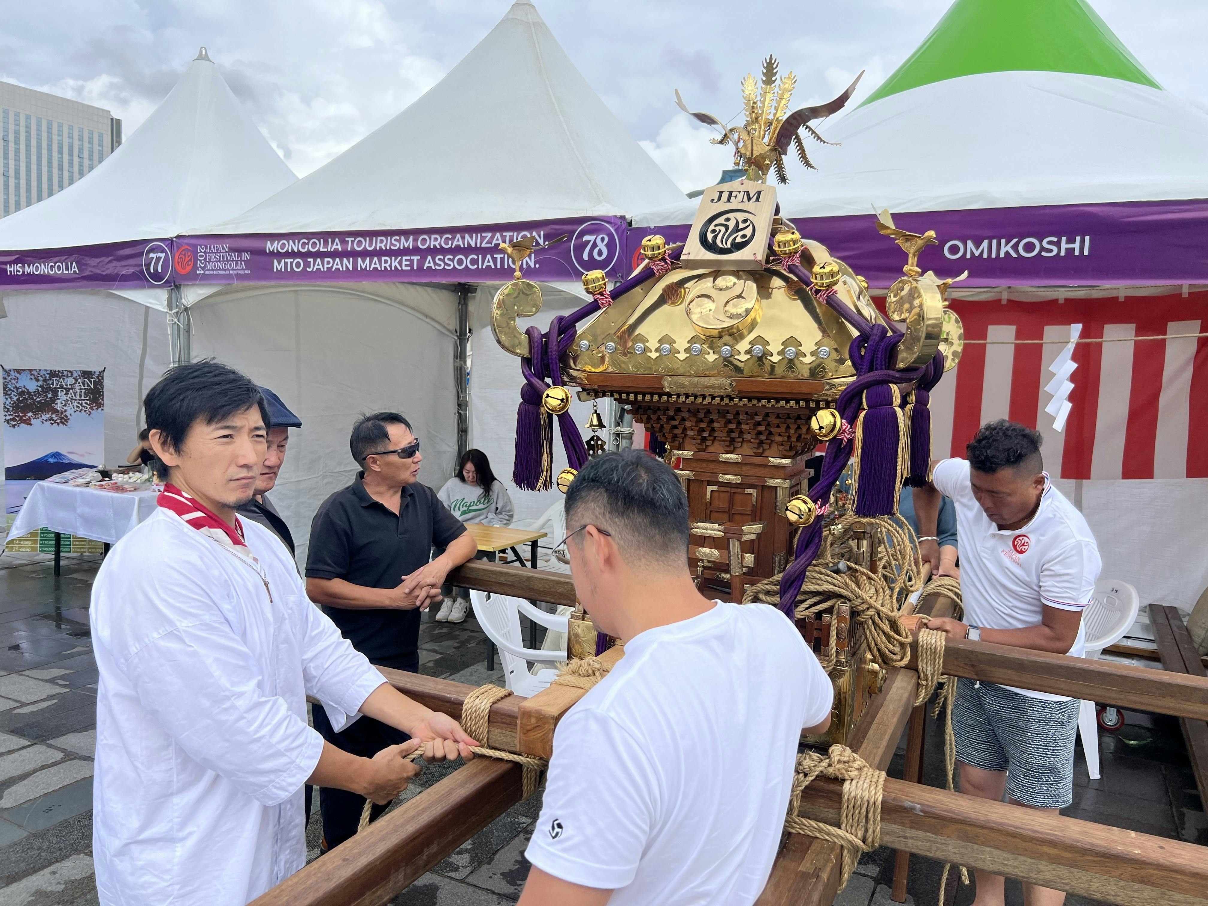 2024/08/24 21:18令和6年8月17日(土)モンゴル・ウランバートル市・スフバートル広場にて行われた『JAPAN FESTIVAL IN MONGOLIA 2024』で、神輿が上がりました!応援してくれた皆様、本当にありがとうございます。当日は、ライブ配信のトラブルなどありましたが、少しでも現場の雰囲気がお届けできていたら嬉しいです。▼ダイジェスト動画は、こちらからhttps://www.instagram.com/reel/C-459MrPije/?igsh=MTR3aHdtczRtNjl0bA%3D%3D現在の支援金額合計は、838,200円、合計79人の方にご支援いただいています。我々の活動を知り、共感してくださり、想いを寄せてくださった方がこんなにもたくさんいると思うと、本当に嬉しいです。目標金額を達成できるよう、残り1週間、活動について知ってもらえるよう努力して参ります。お力添えいただけると大変嬉しいです!今回の記事では、事務局の伊藤から当日の様子をご報告します。JAPAN FESTIVAL IN MONGOLIAとは?今回神輿が上がったのは『JAPAN FESTIVAL IN MONGOLIA 2024』という、モンゴル最大規模の日本文化を伝えるイベント。伝統芸能、ポップカルチャー、最新の技術を通じて新しい機会の扉を両国の若者に開き、お互いの経験、興味、希望を分かち合い、今後の進展、成功に役立てることを目的としており、2024年は『全ては将来のために』というテーマで開催されました。令和4年に初めてモンゴルで神輿が上がったのも、『JAPAN FESTIVAL IN MONGOLIA 2022』。外交関係樹立50周年の記念の年に、初めて神輿が上がり、そこから2年経ち、先日2度目の神輿が上がりました。当日の様子8月17日(土)、朝8:30頃に会場であるスフバートル広場に到着。小雨でした。(代表・宮田と神主・柴田氏の後ろ姿。祭エンジンロゴ入りダボシャツも作りました!)まずは神輿の組み立てです。日本でもモンゴルでもやることは変わらないな〜、と感じる個人的に好きな瞬間です。皆で力を合わせ、順調に組み上がりました。(クラファンのリターンにある祭エンジンTシャツを着てます。)イベントの開始は、11:00。両国の国歌斉唱でスタートしました。(日本からは、コーラス隊として子ども達もきていました。)和太鼓や、日本舞踊など、日本の伝統文化を披露するプログラムもたくさん。(モンゴル人の方々が日本の和太鼓を練習したそうです!感動!)(日本舞踊の美しい舞と音楽で、会場全体に日本の空気が流れていました。)前日の台風の影響で飛行機が遅延した影響で、プログラムが大幅変更になり、神輿は2時間ほど遅れての出発に。出発前に神事を行います。神主であり、明日襷の理事でもある柴田良一氏(通称:りょうちゃん)に執り行っていただきました。(祝詞奏上。神様をお呼びします。)(玉串奉奠。神輿の成功を祈ります。)さて、準備が整いました!海外では、事前に告知をして担ぎ手を集めるケースと、その場で担ぎ手を募集するケースがありますが、今回は後者でした。神事が始まる前、飛び入り参加者を増やすために、モンゴル語を書いた紙を掲げながら、走り回って呼びかけました!(ちなみに、モンゴルでは基本的には英語も日本語も通じません。モンゴル語は、挨拶の言葉しか知らないので、現地の方に協力してもらって、文字にしよう!と急遽作成。)(みんなで担ごう!誰でも参加できます!)(キックオフイベントのゲスト清水さんのお友達、ニャマーさん親子も来てくれました!こうしてご縁が繋がっていくのが本当に嬉しいです。)ニャマーさん親子にも呼びかけを手伝ってもらったおかげで大成功!次々とモンゴル人の方が集まってくれて、見事神輿が上がりました!!(首都ウランバートルの中心で、神輿が輝きました!カッコ良い!)お神輿が動き出すと、会場の雰囲気がガラリと変わります。人が集まってきて、立ち止まってカメラを構えたり、手を叩いて応援してくれたり、じっと眺めていたり。賑やかに、スフバートル広場を練り歩くことができました!2年前、初めて神輿が上がった時にも参加していた運営の方や、担ぎ手として入ってくれた学生たちが「楽しみに待っていたよ!」と、また参加してくれて、本当に嬉しかったです。(2年前も担いでくれたスガルさん!力強く担いでくれました!)(2年前に担いでくれた医学生のウノくん!忙しい中駆けつけてくれました!)お神輿を運行していると、どこからか小さな女の子が「私もやりたい!」と飛んできました。神輿の近くは危ないので、神主りょうちゃんと一緒に歩いてもらうことに。(りょうちゃんと一緒にお神輿を先導。後ろのお神輿が気になる様子。)みんなの真似をして「わっしょい!わっしょい!」と言いながら、担ぎ手に元気を与えてくれました。人懐っこくて可愛い女の子は、「私ね、おまつり、好き!おみこし、たのしいね!」とたくさん話しかけてくれます。「妹も、一緒に来てるんだ!」と小さな妹さんのことも紹介してくれました。二人で「っしょい!っしょい!」と一生懸命声を出している姿がとても愛おしかったです。日本語がとっても上手なので、日本から旅行にきていたのかな?なんて考えて