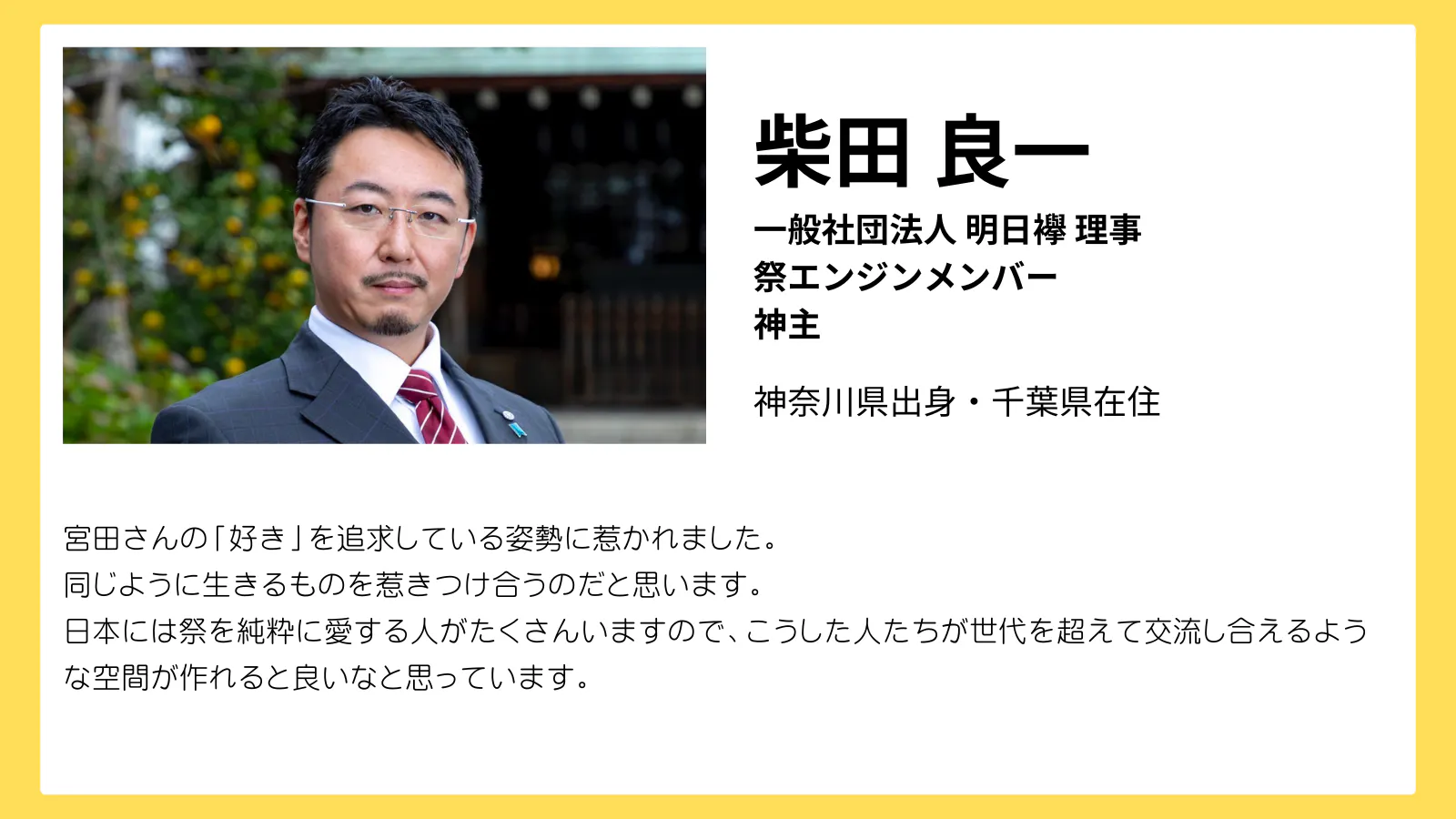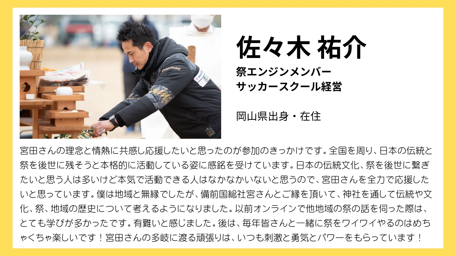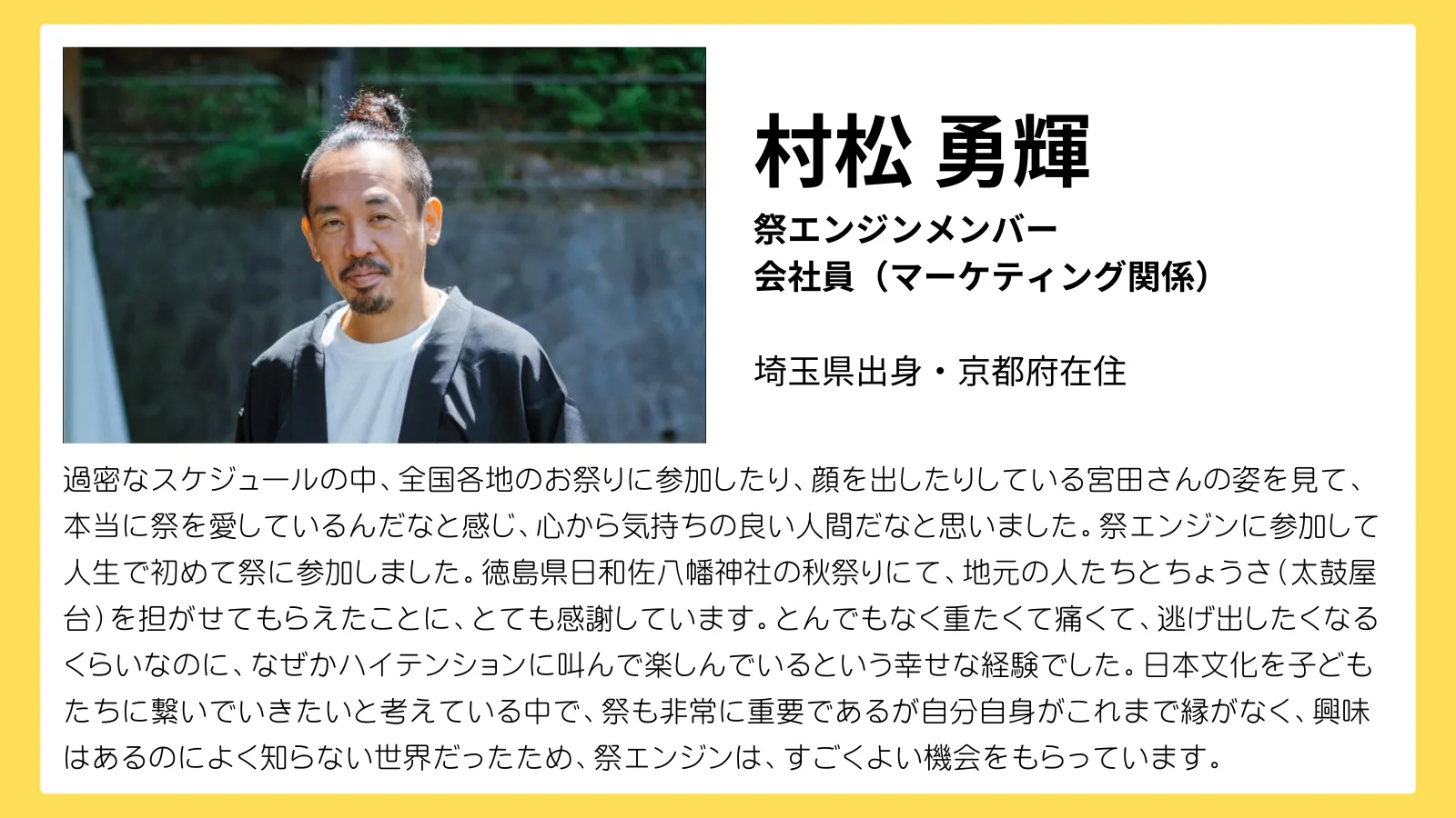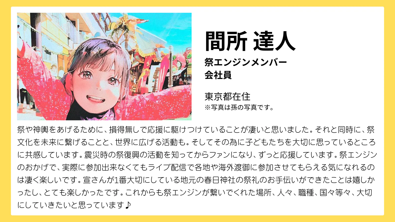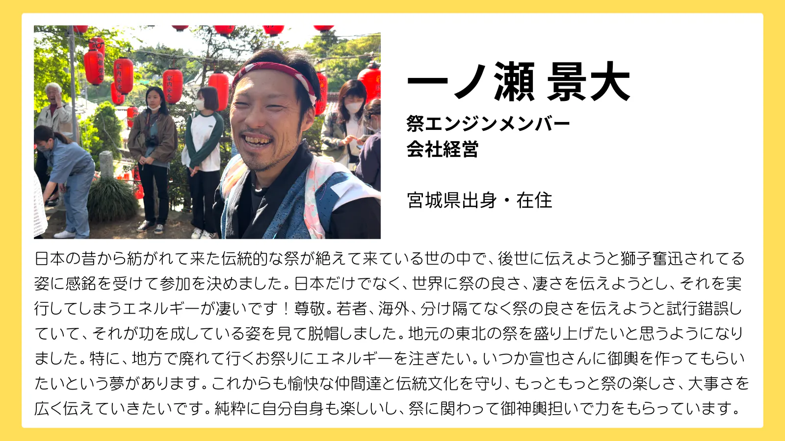 「そして日本の祭の価値をもう一度みんなで見直すきっかけとなるような機会を作り、次世代へ祭文化を届けるために挑戦し続けていきたい。」