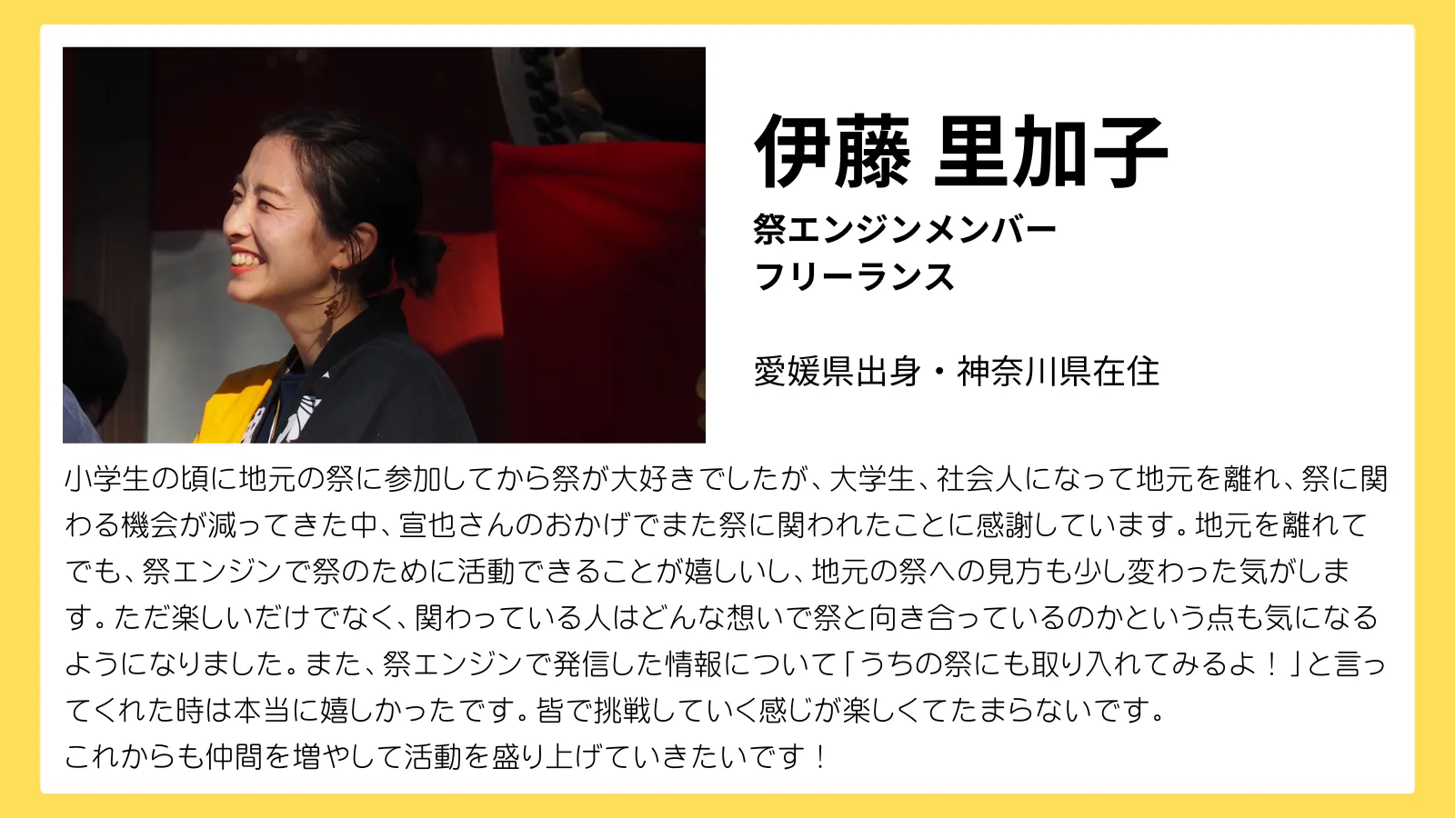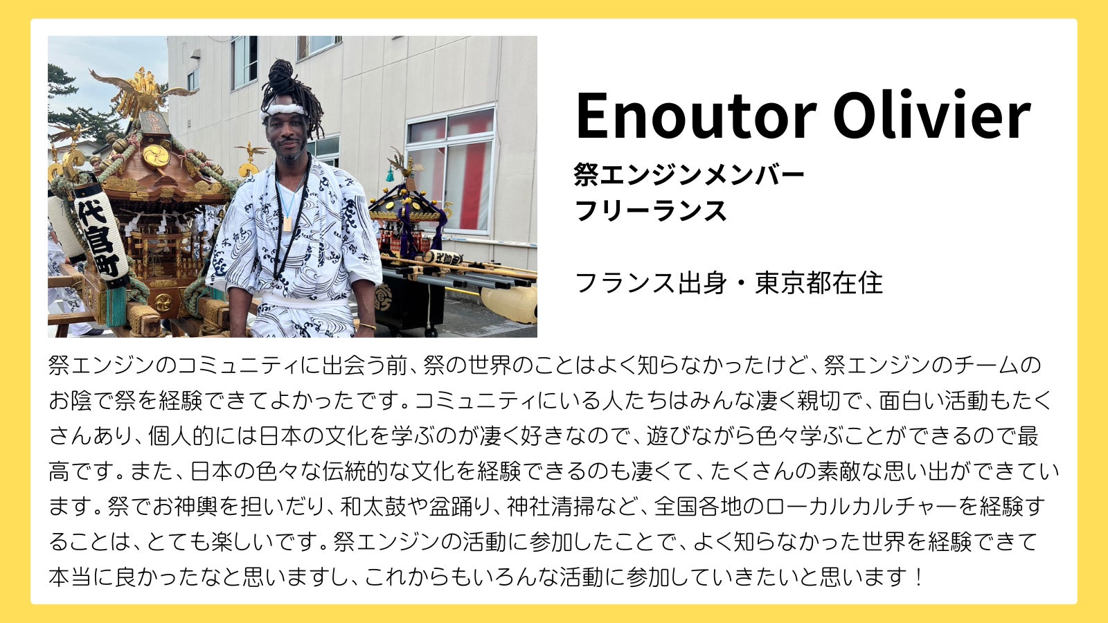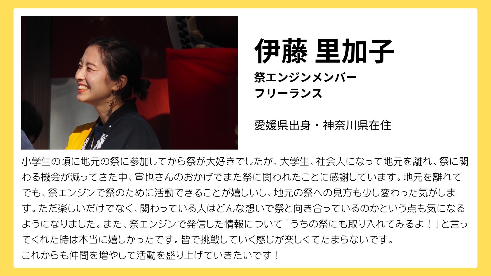 2021年には、『祭エンジン』という祭の魅力を発信、共有し合うコミュニティを立ち上げ、こちらでも代表をつとめています。全国各地、そして海外の仲間たちと楽しく活動しています。
