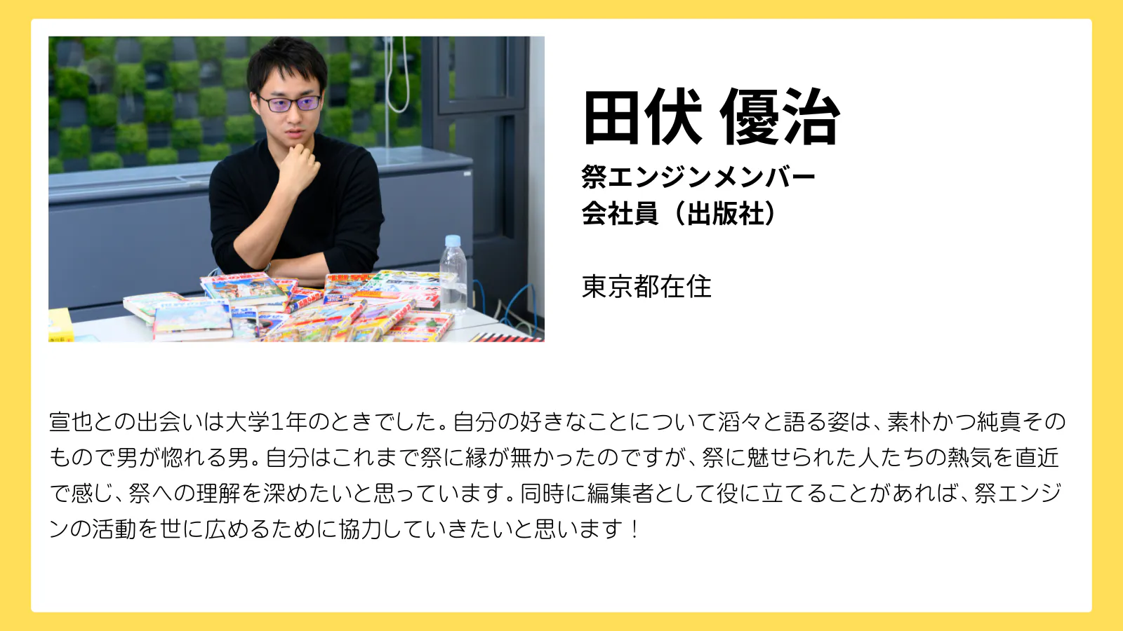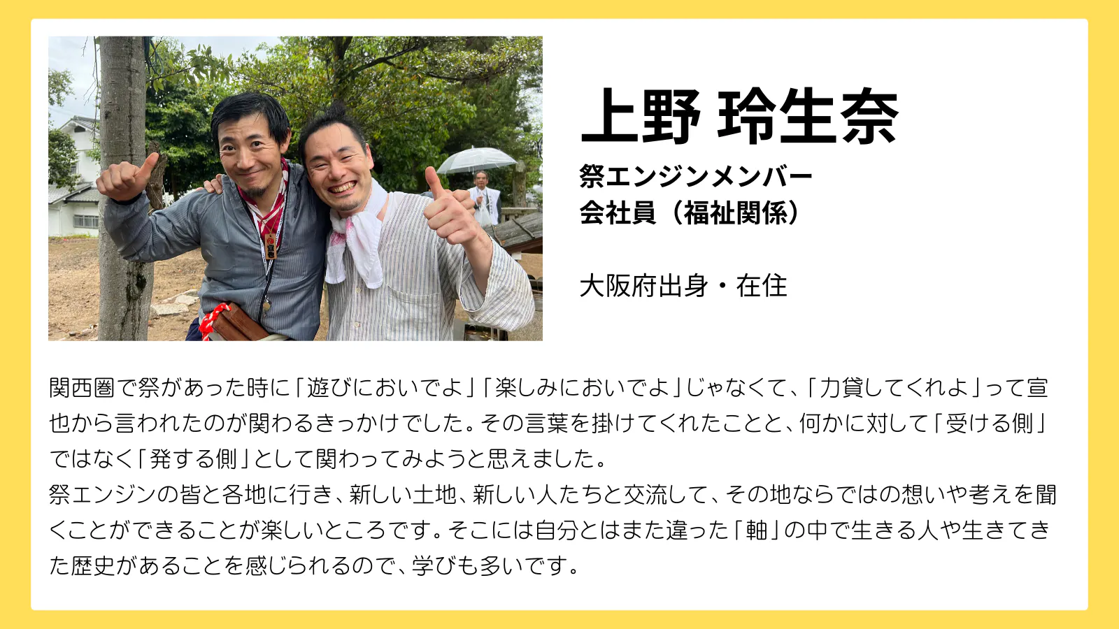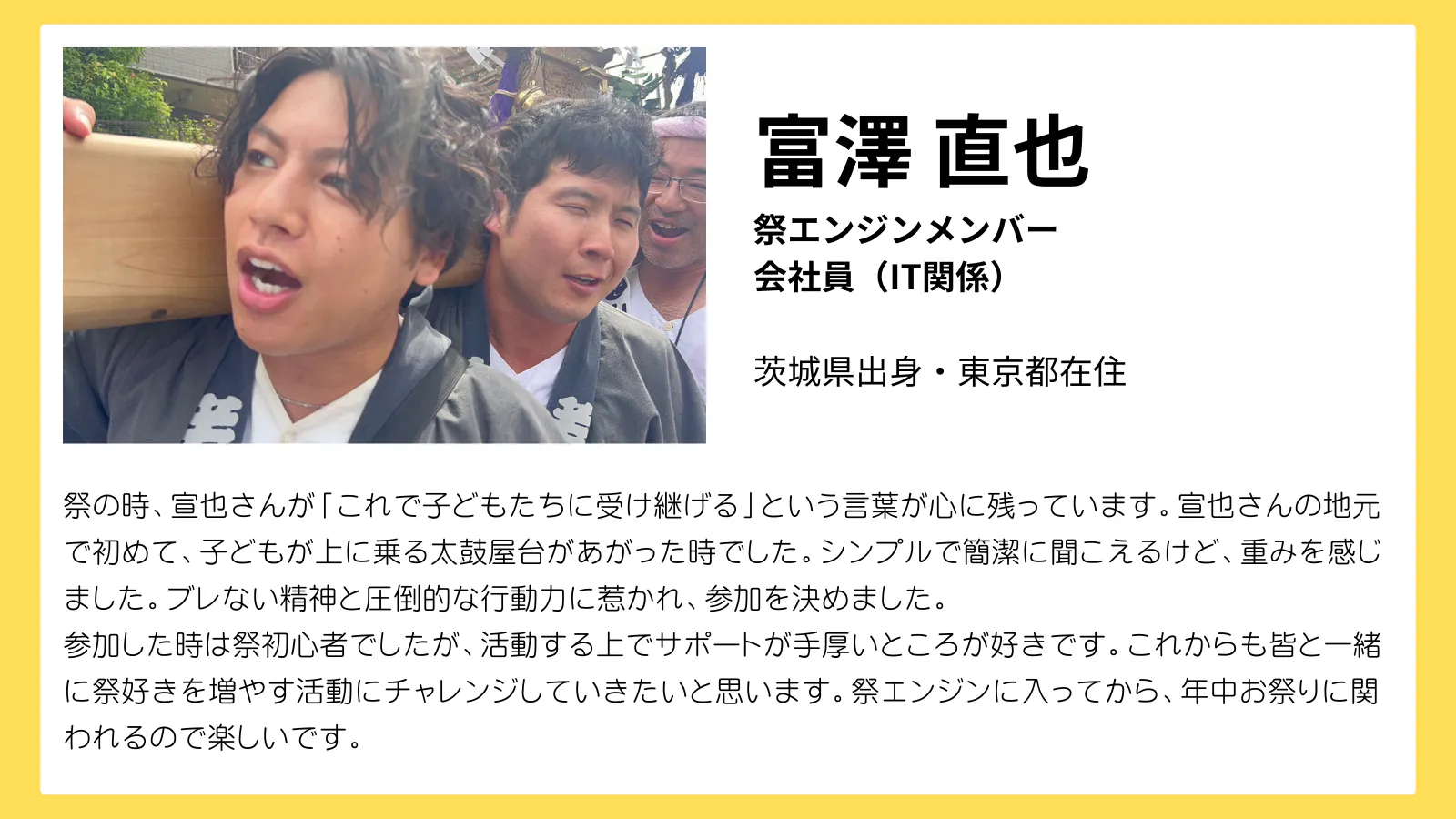 2021年には、『祭エンジン』という祭の魅力を発信、共有し合うコミュニティを立ち上げ、こちらでも代表をつとめています。全国各地、そして海外の仲間たちと楽しく活動しています。