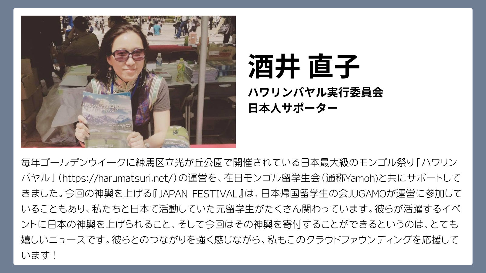 2024/08/17 11:17スフバートル広場の会場から更新しています。ただいま神輿組み立て中!日本から嬉しいメッセージが届いたので、ご紹介します!「ハワリンバヤル」という日本最大級のモンゴルのお祭りの実行委員会で日本人サポーターをつとめる酒井直子さんです。酒井さんは、関内でのキックオフイベントにもご参加くださいました。たくさんの応援を本当にありがとうございます!!↓応援メッセージは、こちら-----------毎年ゴールデンウイークに練馬区立光が丘公園で開催されている日本最大級のモンゴル祭り「ハワリンバヤル」(https://harumatsuri.net/)の運営を、在日モンゴル留学生会(通称Yamoh)と共にサポートしてきました。今回の神輿を上げる『JAPAN FESTIVAL』は、日本帰国留学生の会JUGAMOが運営に参加していることもあり、私たちと日本で活動していた元留学生がたくさん関わっています。彼らが活躍するイベントに日本の神輿を上げられること、そして今回はその神輿を寄付することができるというのは、とても嬉しいニュースです。彼らとのつながりを強く感じながら、私もこのクラウドファウンディングを応援しています! (ハワリンバヤル実行委員会日本人サポーター 酒井直子)-----------酒井さん、本当にありがとうございます!いよいよ始まります!! もっと見る