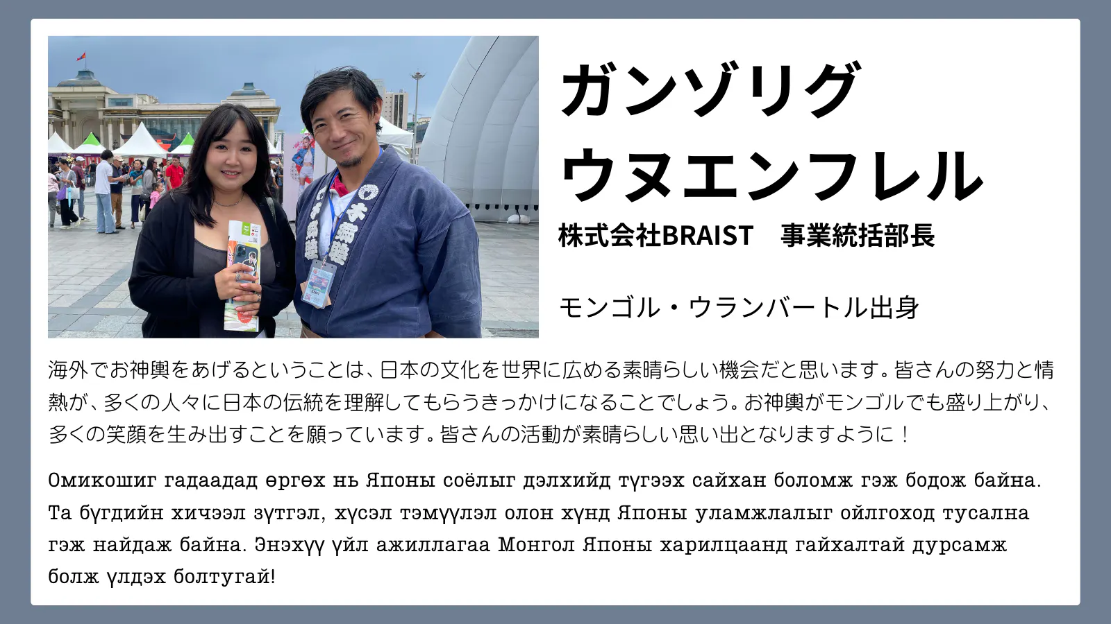 【応援メッセージ:株式会社BRAIST 事業統括部長 ガンゾリグ・ウヌエンフレルさま】
