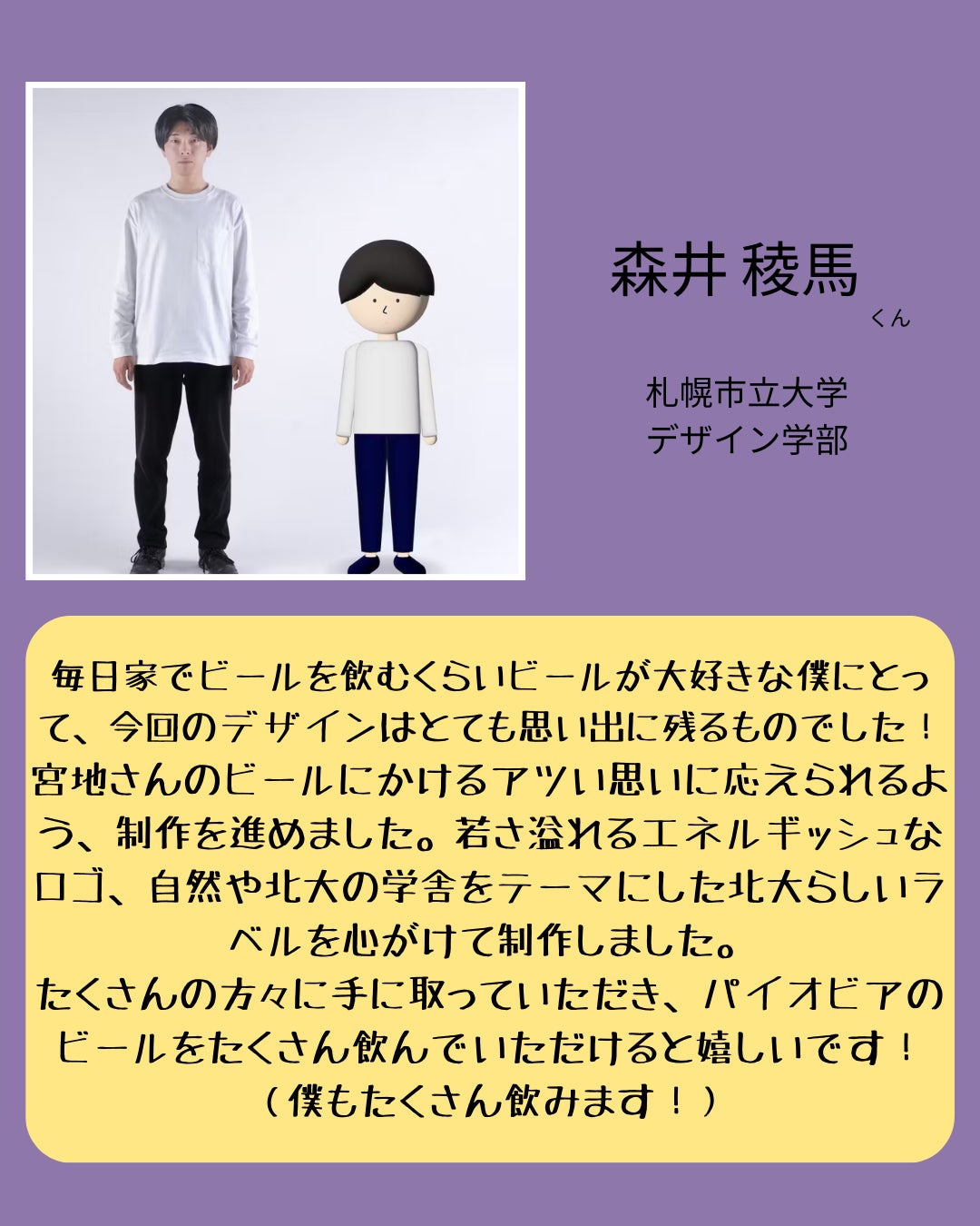 友人のご紹介のおかげで、札幌市立大学デザイン学部の森井稜馬くんに依頼させていただきました。(彼も大のビール好きです笑)