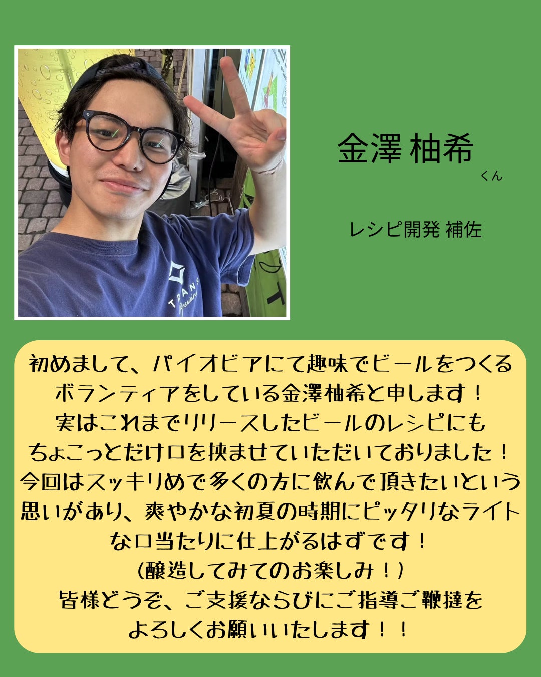 今回のレシピ開発は、これまでビールづくりに携わっている金澤柚希(かなざわゆずき)が手伝ってくれました!