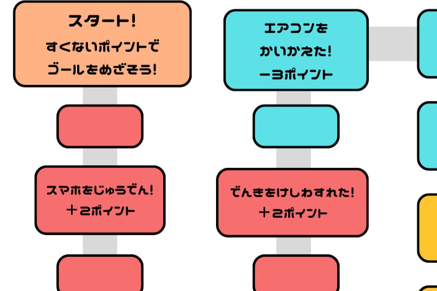 たとえば、「暑いので冷房を使った → +5ポイント」といった具体的なシナリオが⽤意されており、太陽光パネルで発電すると「-5ポイント」を獲得するなど、エネルギーの使い⽅を考えさせる要素が盛り込まれています。