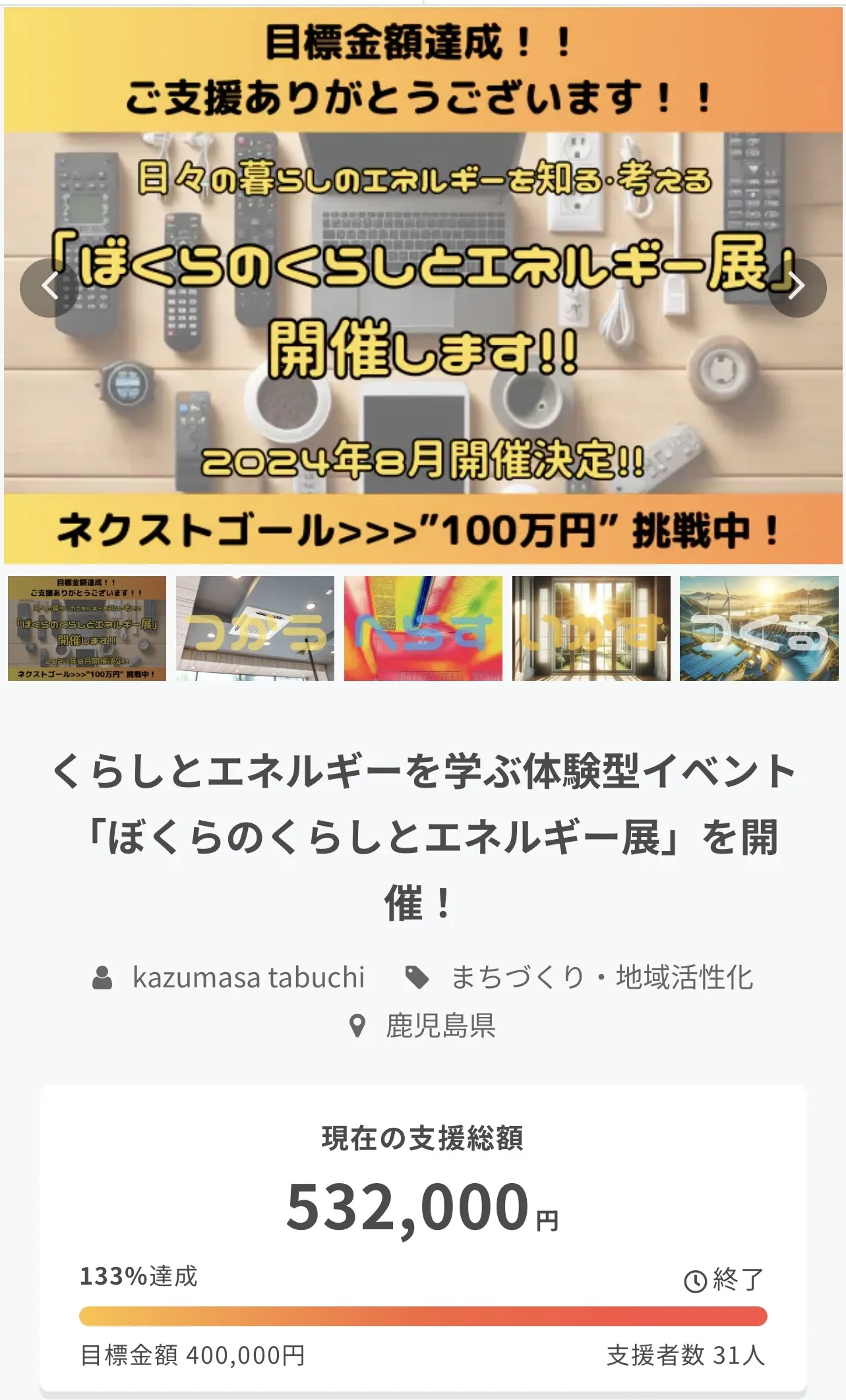 07月26日(金)23:59、「ぼくらのくらしとエネルギー展」クラウドファンディングが終了しました。ご支援・拡散へのご協力、誠にありがとうございます。