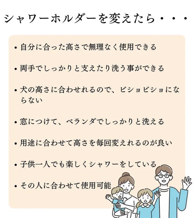 それは、健常者にとっては良いものかもしれませんが、シャワーの高さで困るのは、ペットやお子さん、高齢者など優しく接してあげる必要のある人たちです。ということは、健常者が喜ぶのはもちろん、世間的に立場が弱いと言われる人たちが納得するものをつくる必要があります。