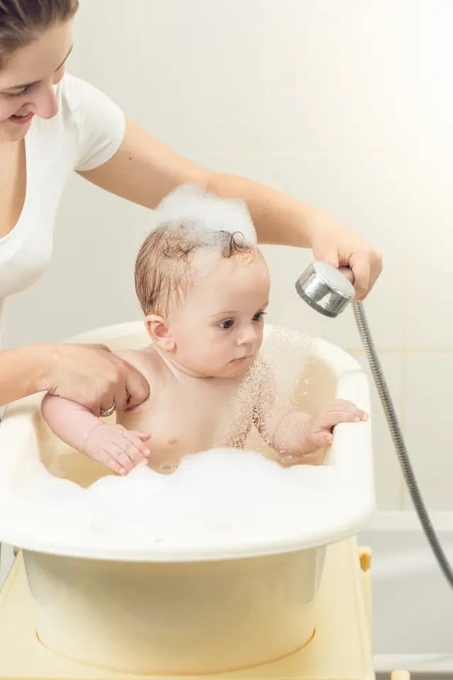 急に動いたり、両手じゃなくては洗いにくい場所のある赤ちゃんとの入浴をサポートします。