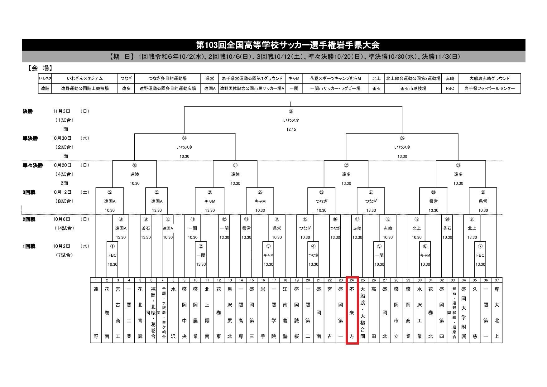 2024/10/01 22:0010月2日(水)より最後の大会となる選手権岩手県大会が始まります。不来方高校サッカー部は、2回戦からの登場となり10月6日(日)の13:30より大船渡赤崎グラウンドにて大船渡・大槌合同チームとの初戦を迎えます。順調に勝ち上がった場合、以下の試合日程となります。・3回戦 → 10月12日(土) つなぎ多目的運動場 13:30KO・準々決勝 → 10月20日(日) 遠野運動公園多目的運動広場 13:30KO・準決勝 → 10月30日(水) いわぎんスタジアム 13:30KO ・決勝 → 11月3日(日) いわぎんスタジアム 12:45KO 以下のホームページから大会の日程・結果が確認できます。岩手県大会日程・結果手強い相手との戦いが続きますが、ひとつでも多く勝ち進めるように熱い応援をよろしくお願いします! もっと見る