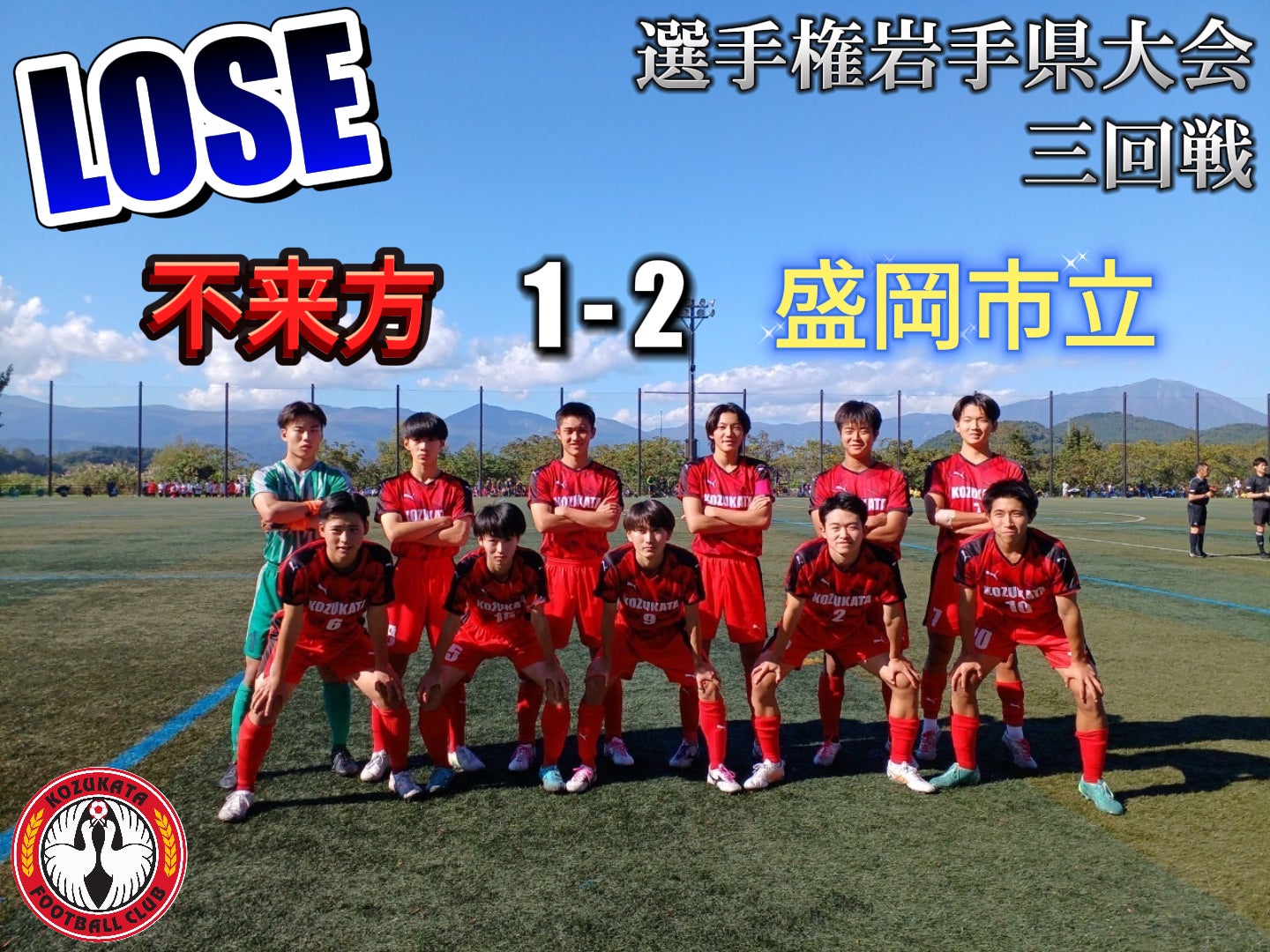 2024/10/15 12:5310月12日(土)13:00 選手権岩手県大会3回戦 つなぎ多目的運動場にて盛岡市立高校と対戦しました。試合当日は、たくさんの方が応援に駆けつけてくれました!誠にありがとうございました! 試合はキックオフ直後から不来方高校サッカー部が果敢に攻め込みます。 前半9分に山崎のアシストにより左サイドからMF伊藤がシュートを決め先制します。 勢いにのって追加点を取りたいところですが、度重なる得点のチャンスはあったものの盛岡市立の決死のディフェンスによって追加点を奪えず1-0のまま前半終了。後半の開始から少し流れが悪く、徐々に押し込まれる時間が多くなった後半10分、相手チームのコーナーキックからヘディングで決められ1点を返されます。さらに後半15分またしても同じ内容で追加点を許し1-2と逆点されてしまいます。冷静さを失い焦る不来方高校に対し、相手は落ち着いてさらに攻める時間が続きます。試合終了間際は何度も何度も攻め込みますが盛岡市立の硬い守備を崩すことが出来ず、そのままが試合終了しました。これにより不来方高校サッカー部最後の選手権岩手県大会は3回戦で幕を閉じました。ここで3年生は引退。 志半ばで敗れてしまったこと、本当に残念に思います。 試合後に『勝ったほうが強いのであって、弱いところがあったから負けたのだ』 『あの時こうなっていたら…こうしていれば…のタラレバを負けた理由にして欲しくない』 監督、コーチからの言葉は 次のステージへ進む3年生、1.2年生へと響いたことでしょう。 まだまだ活動報告をしたかったのですが、ここで区切りとさせていただきます。 現地まで来てくれたOB達とその親御さん、同級生、そして今まで応援してくださった皆さまにおかれましては、厚く御礼申し上げます。 まだ不来方高校最後の公式戦として新人戦が残っておりますし、来年からは南昌みらい高校として生まれ変わりますので今後も応援していただけますよう、何卒よろしくお願いします! もっと見る