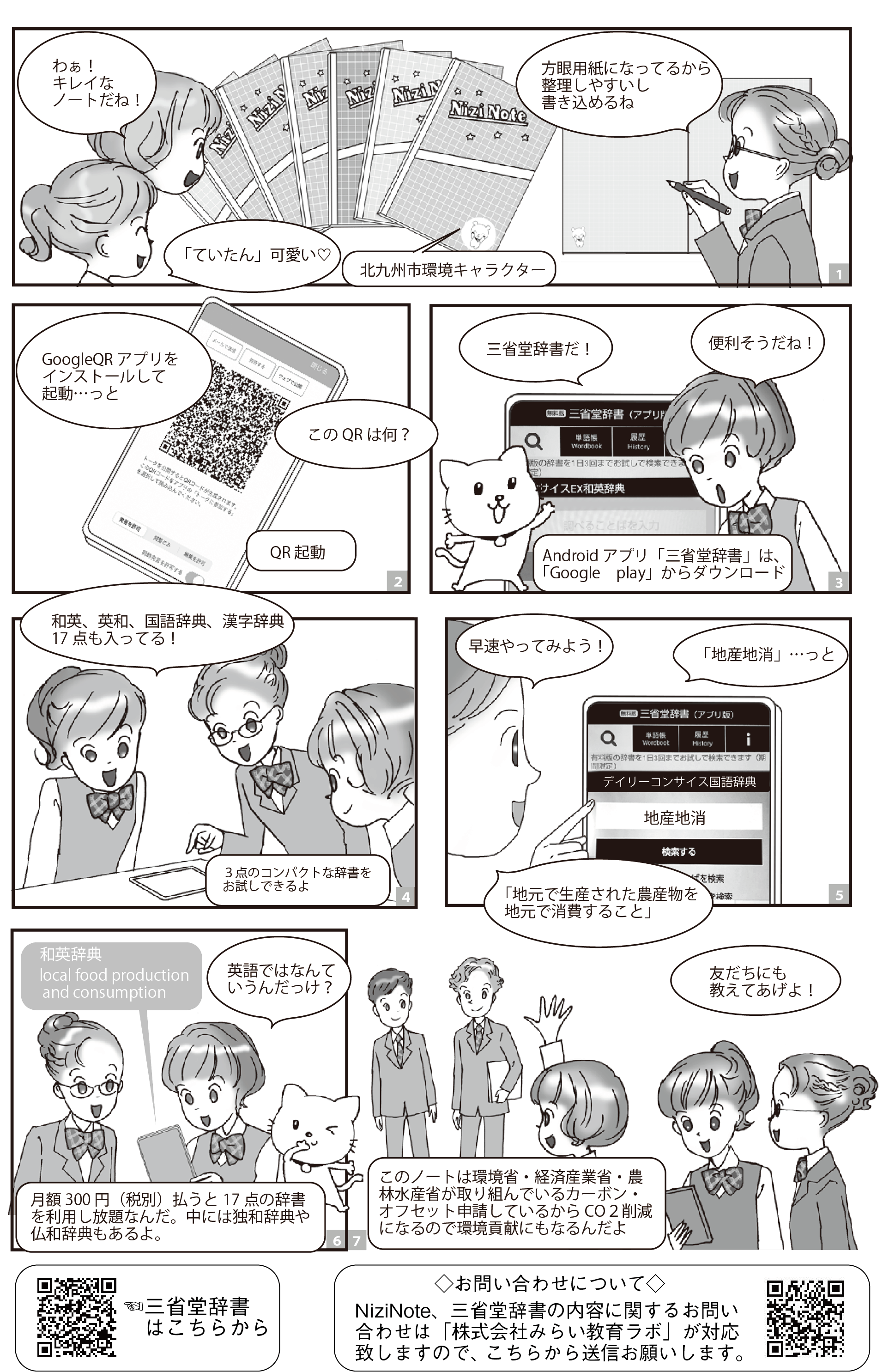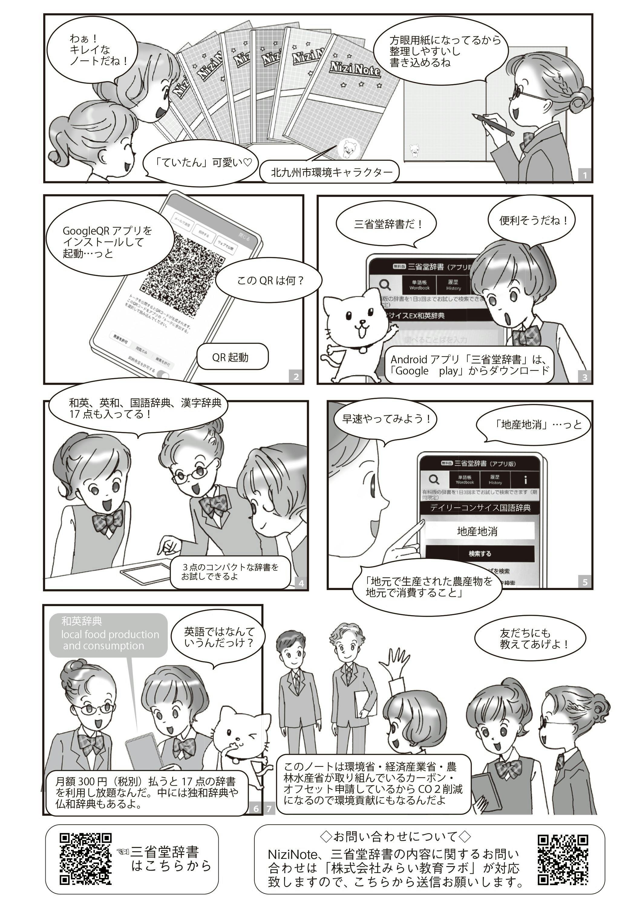 表紙裏にマンガで説明していますが、三省堂辞書のQRコードが付いてますので、スマホQRにかざして頂けれ辞典として活用できます。