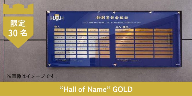 「Hall of Name(特別寄付者銘板)」とK.O.H公式サイトに「ゴールドサポーター」としてお名前を掲出させていただきます。ゴールドサポーターのお名前は、ゴールドのネームプレートで掲げます。