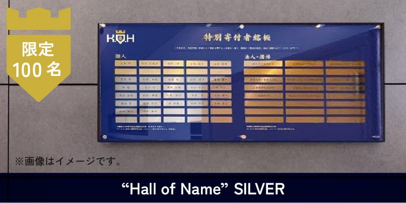 「Hall of Name(特別寄付者銘板)」とK.O.H公式サイトに「シルバーサポーター」としてお名前を掲出させていただきます。シルバーサポーターのお名前は、シルバーのネームプレートで掲げます。