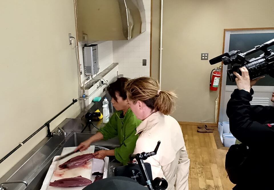 「鰹のたたき」が大好きなスペイン人の女性に藁焼きたたき作りに挑戦していただきました