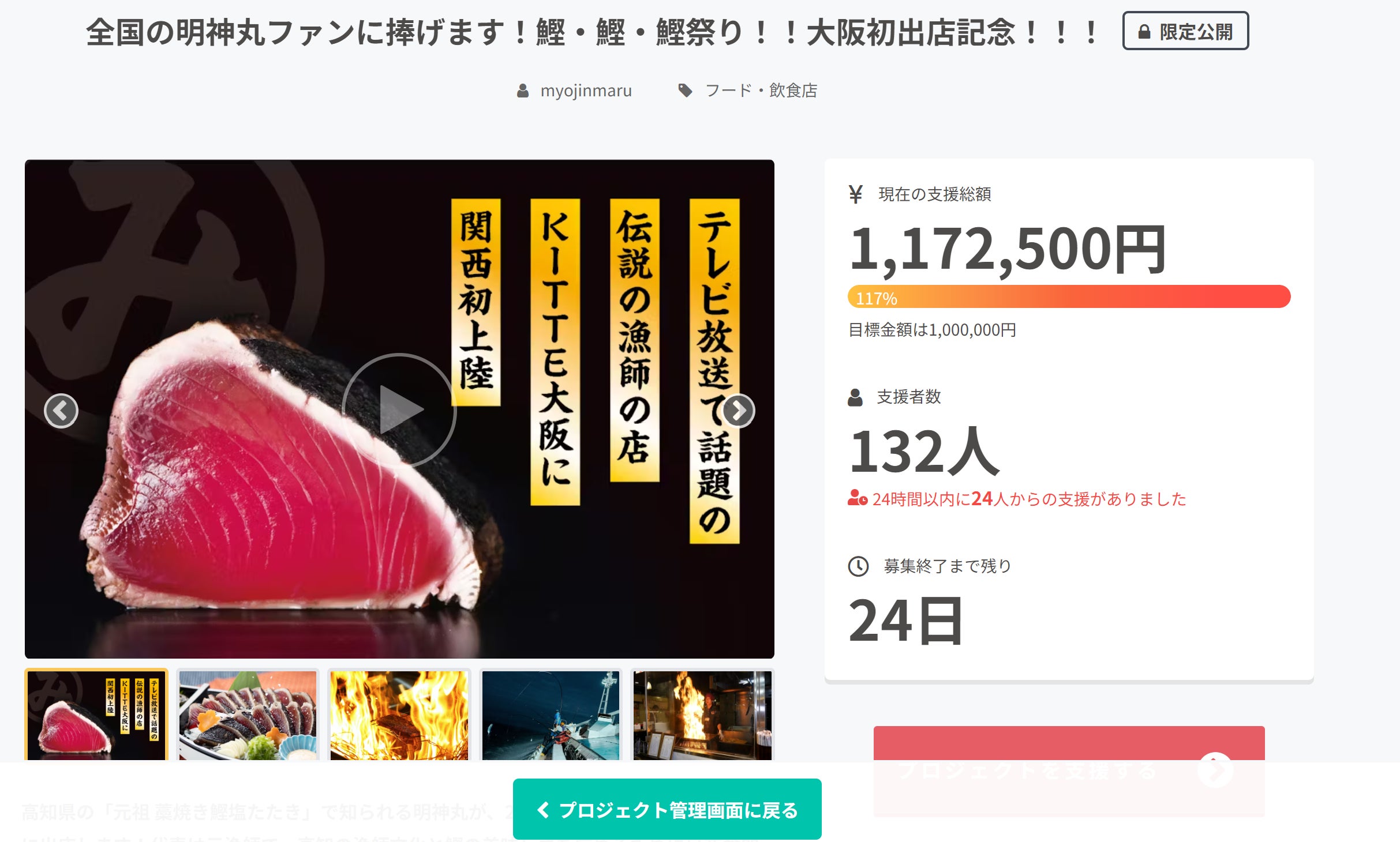 この大阪出店を記念して、全国の鰹好き、明神丸ファンのためのプロジェクトをつくることを決意しました。今回のクラウドファンディング限定メニュー、プレオープンへの参加や、明神水産の水産商品、オリジナルグッズなど、普段は味わえない、見ることのできない、魅力的なリターンを多数ご用意しております。ぜひご参加ください!