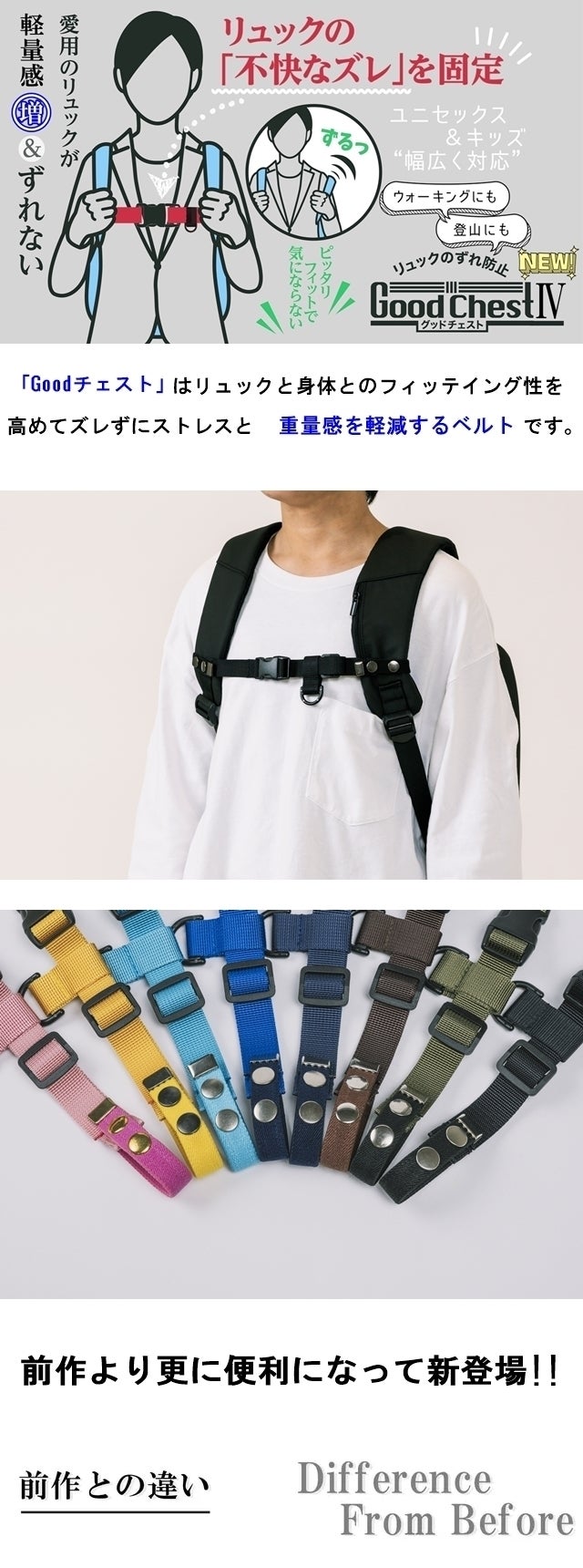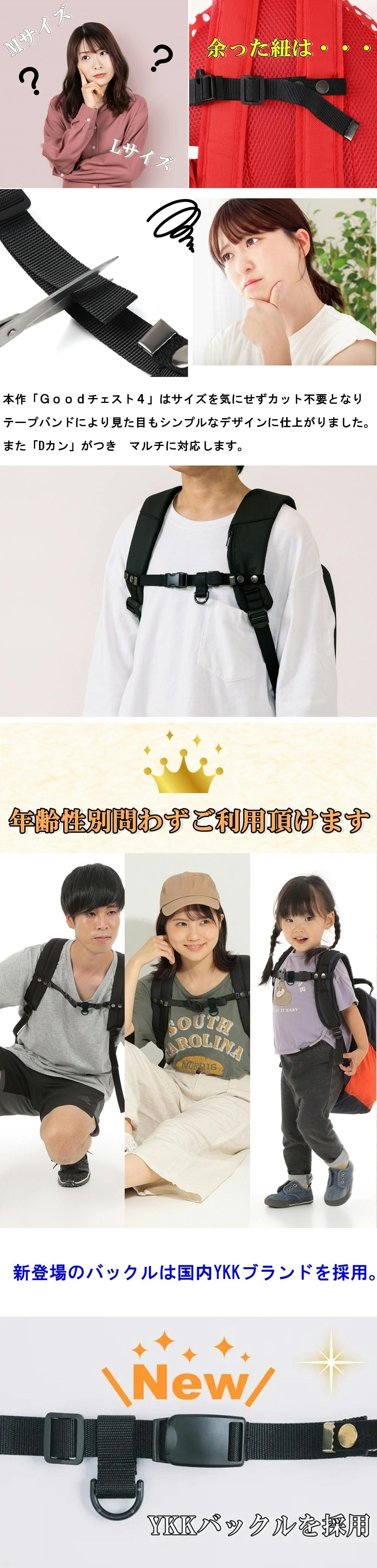 多くのお客様から様々なレビューを頂き 改新し「Goodチェスト4」が誕生しました。皆さま愛用のリュックにご活用頂き リュックと身体とのフィッテイング性を高める役割が出来たら…そんな願いを込めて、リュックとの相性抜群の「Goodチェスト4」を作成しました。