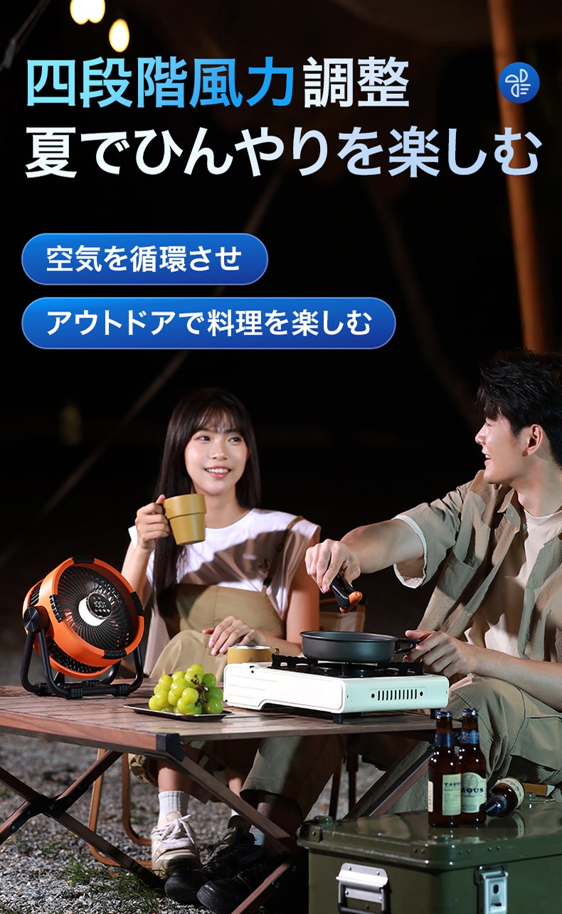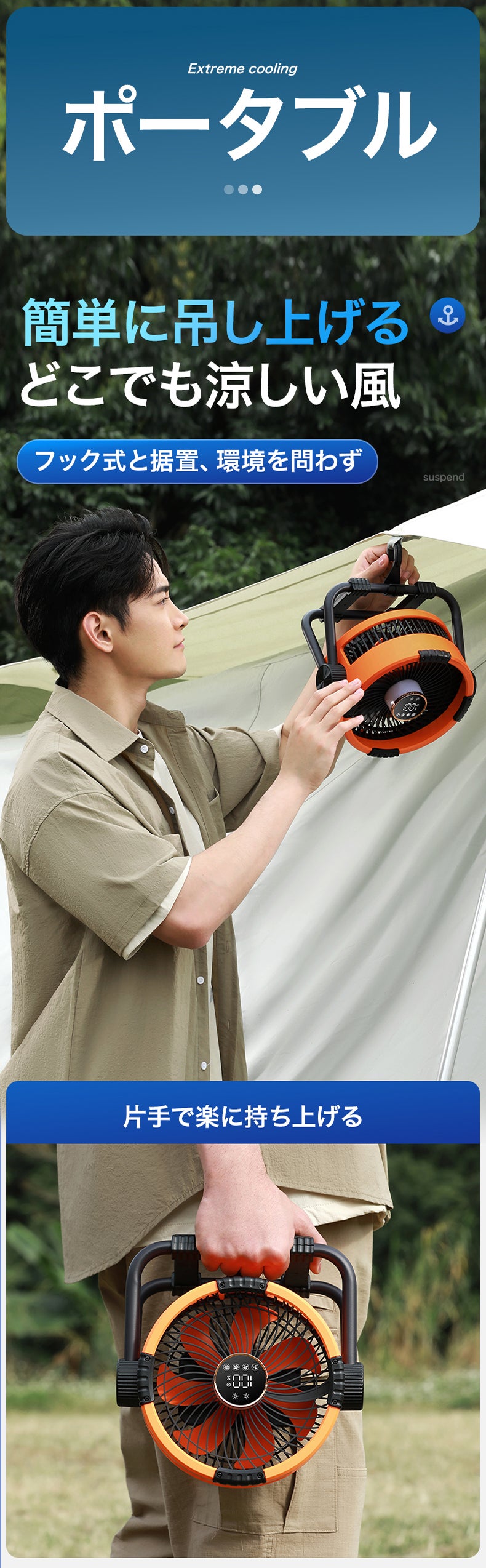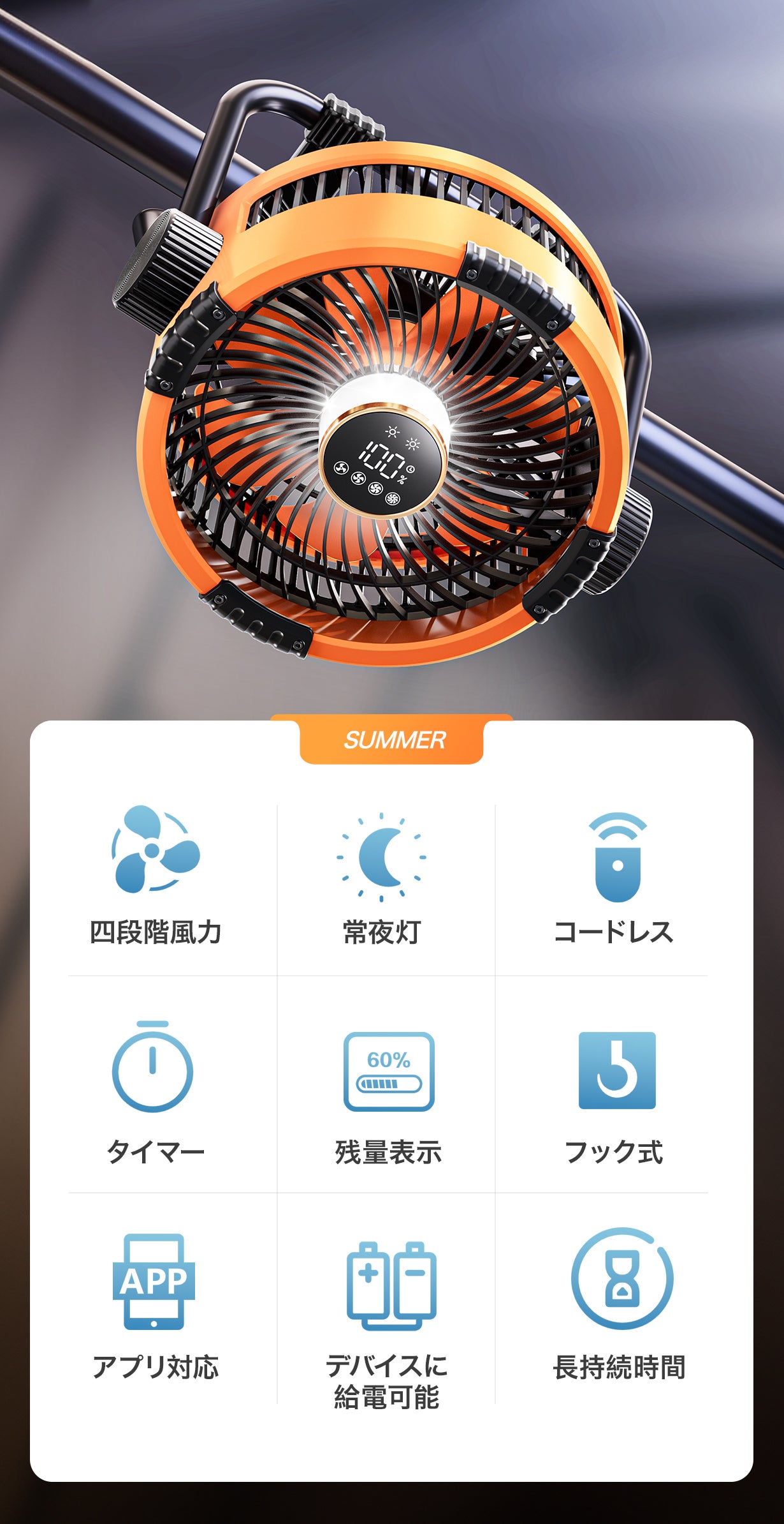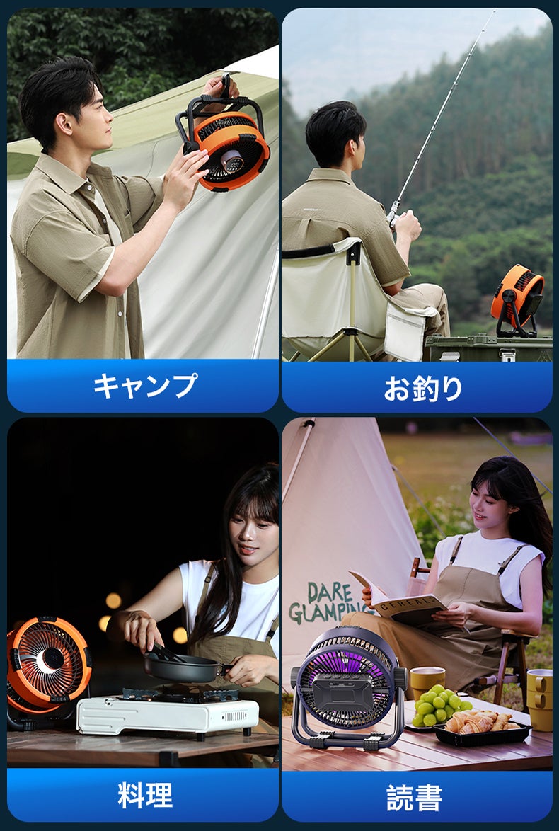 キャンプする場合、扇風機「EWind」のワイヤレス機能と強力なバッテリー容量により、コンセントのない環境でも涼しい風を楽しむことができます。 常夜灯機能は夜間に必要な照明を提供し、フックのデザインはテントや他の場所に便利に掛けることができます。
