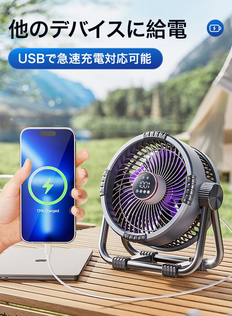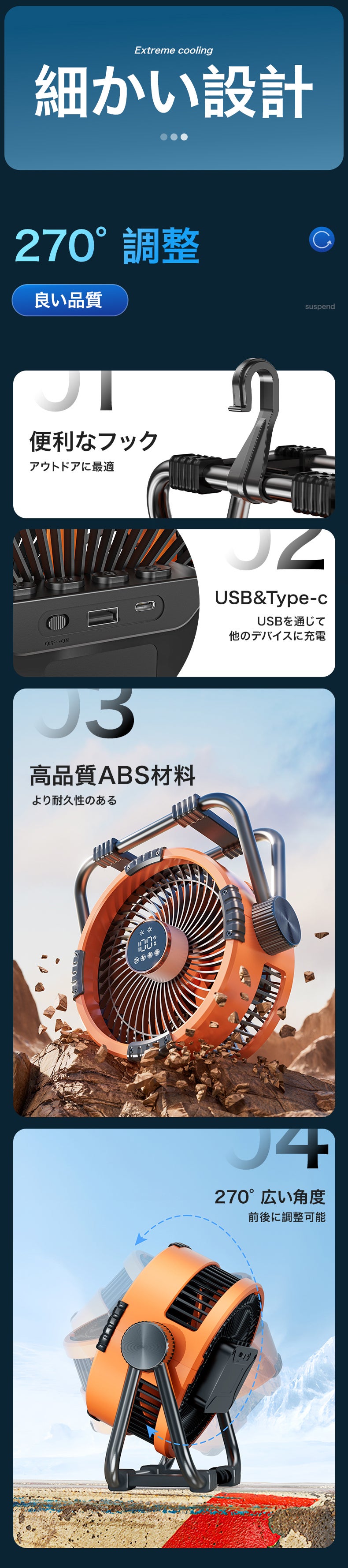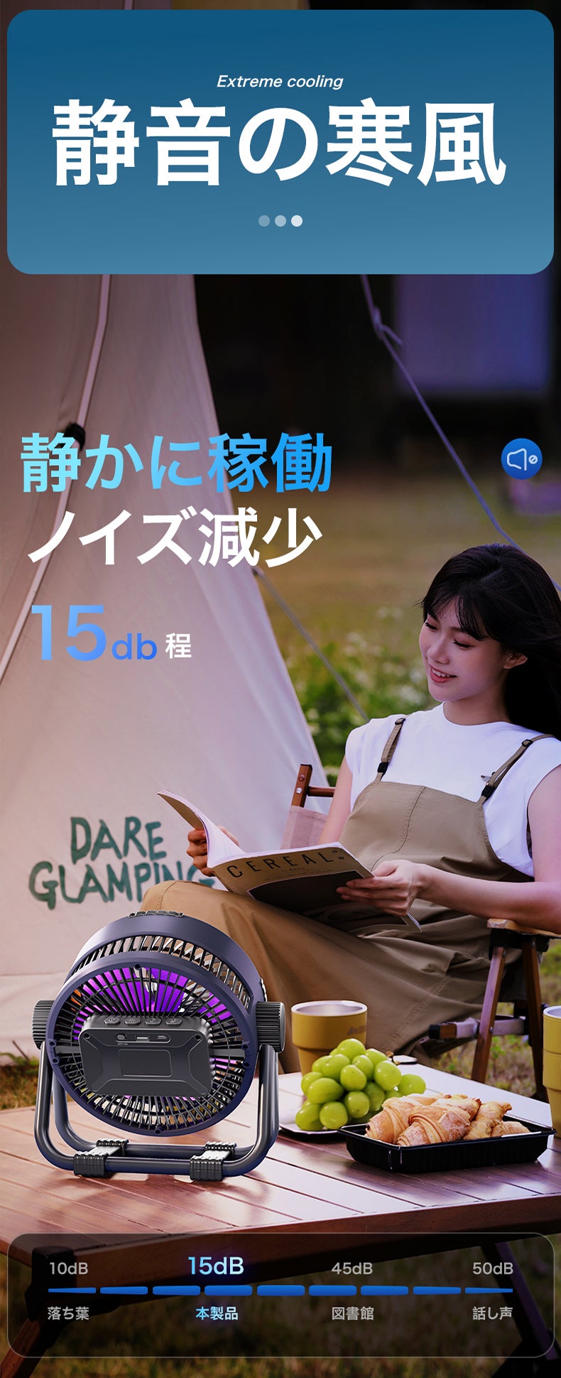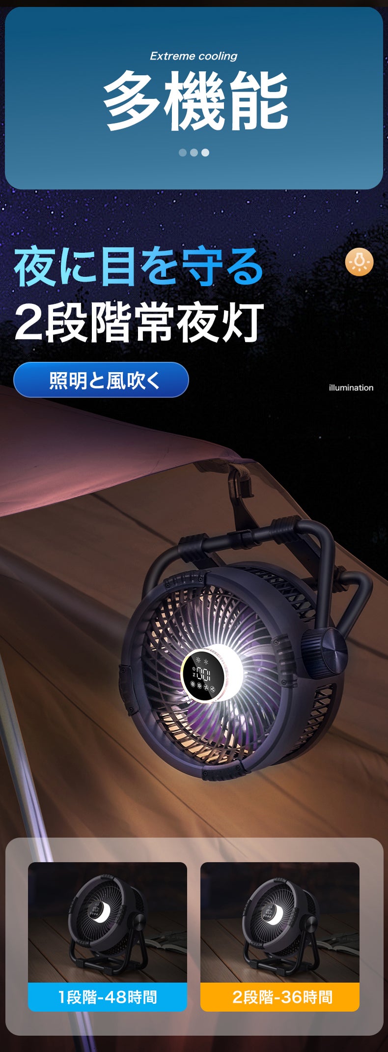 キャンプする場合、扇風機「EWind」のワイヤレス機能と強力なバッテリー容量により、コンセントのない環境でも涼しい風を楽しむことができます。 常夜灯機能は夜間に必要な照明を提供し、フックのデザインはテントや他の場所に便利に掛けることができます。