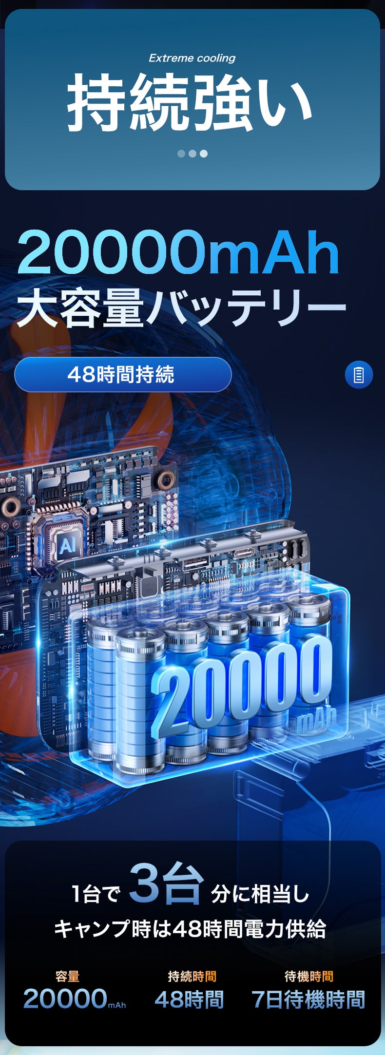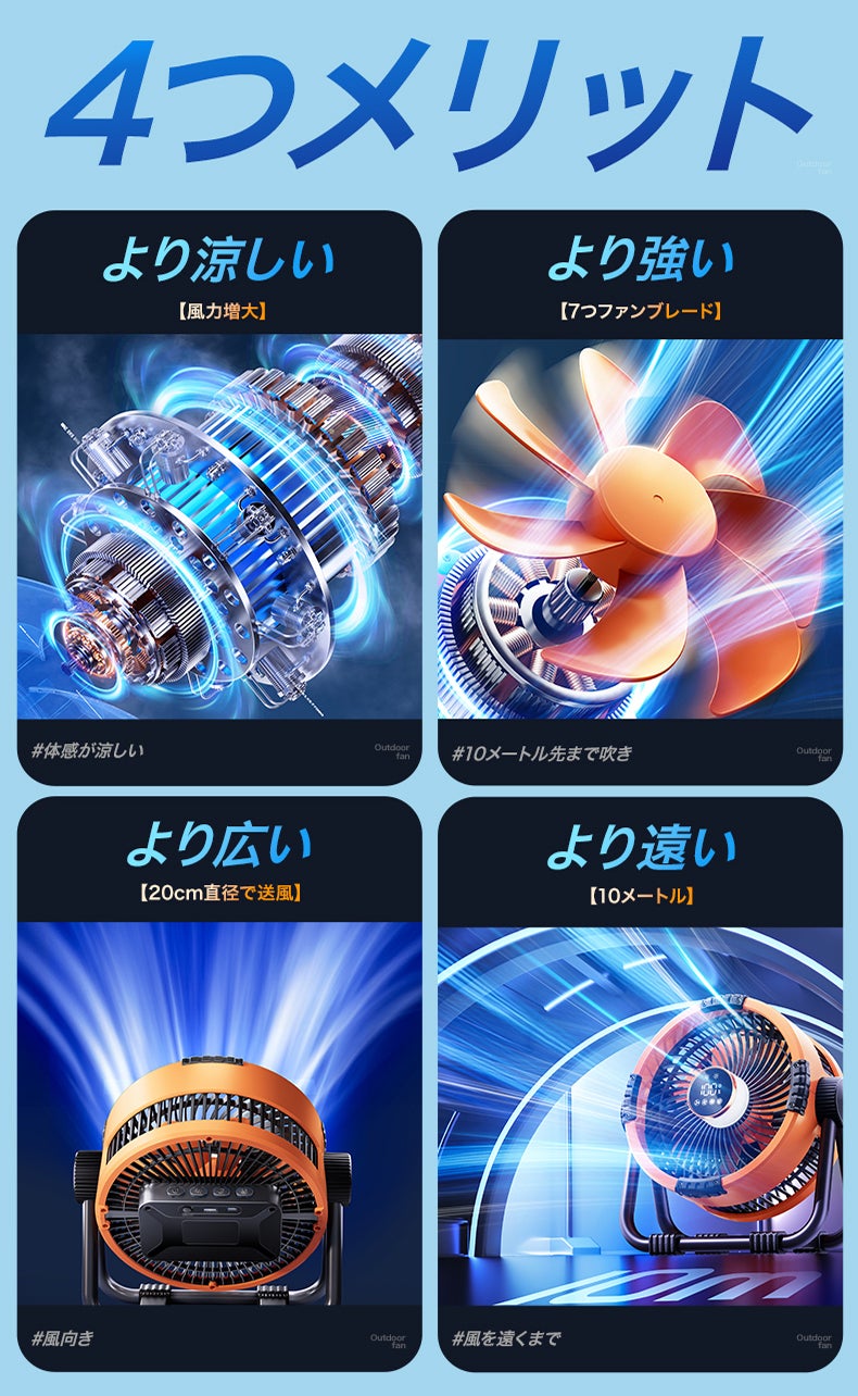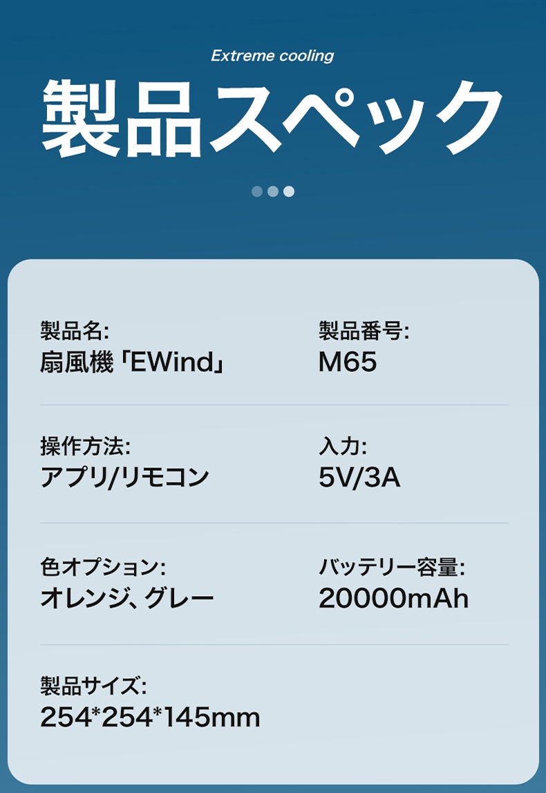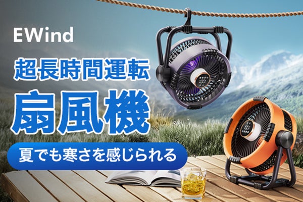 そのため、扇風機「EWind」を開発されました。コンパクトサイズに2万mAhのバッテリーが内蔵され、LEDディスプレイ残量表示、2段階調整のランプとコードレスの設計、マルチアングル調整、四つ段階広範囲の風吹、据え置くと吊し上げ対応可能、アウトドアもピッタリです。