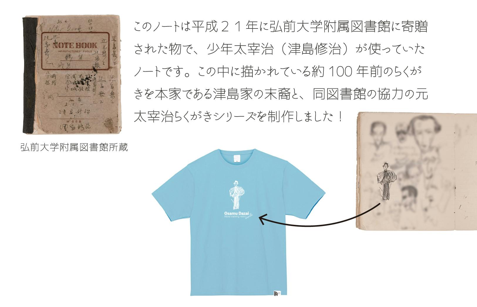 少年時代の太宰治がノートに描いたらくがき(弘前大学附属図書館所蔵)をプリントしたTシャツをご紹介します!