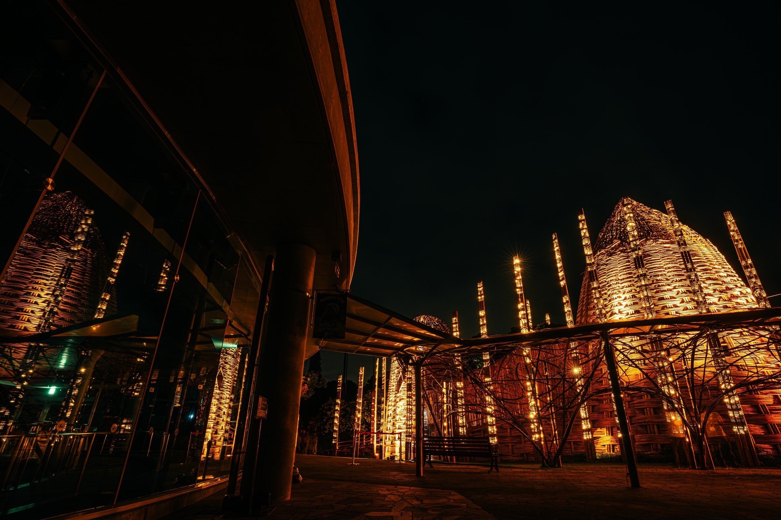 ライトアップされ、夜空に浮かび上がる巨大なアートの姿。