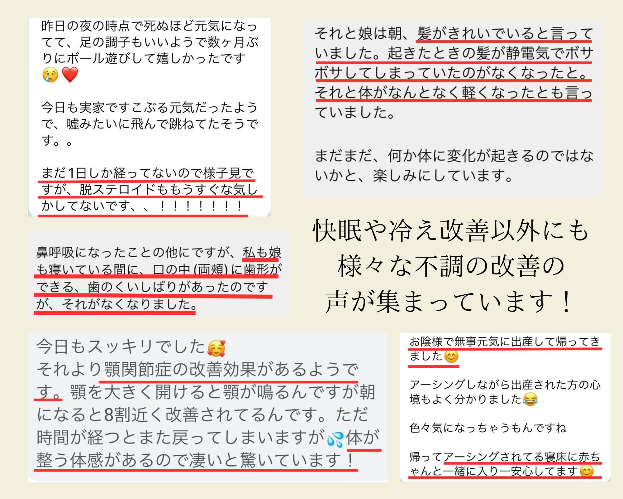 ・おかげさまで娘のおねしょがマットを始めたらぴたりと止まりました。布団から外れて床上で寝てしまった時だけおねしょしてしまいましたが。やっぱり帯電がおねしょの原因だったのかなと思います。やってみてよかったです。