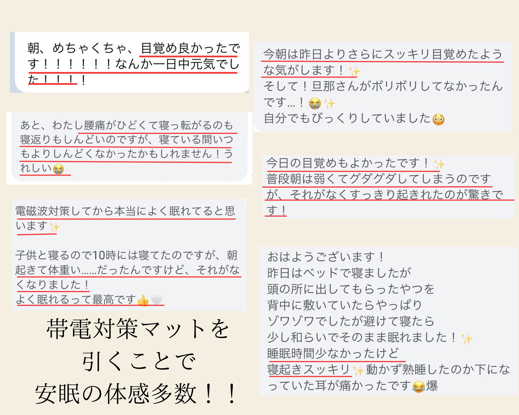 ・帯電対策してから本当によく眠れてると思います。子どもと寝るので10時には寝てたのですが、朝起きて体重い……だったんですけど、それがなくなりました!よく眠れるって最高です!