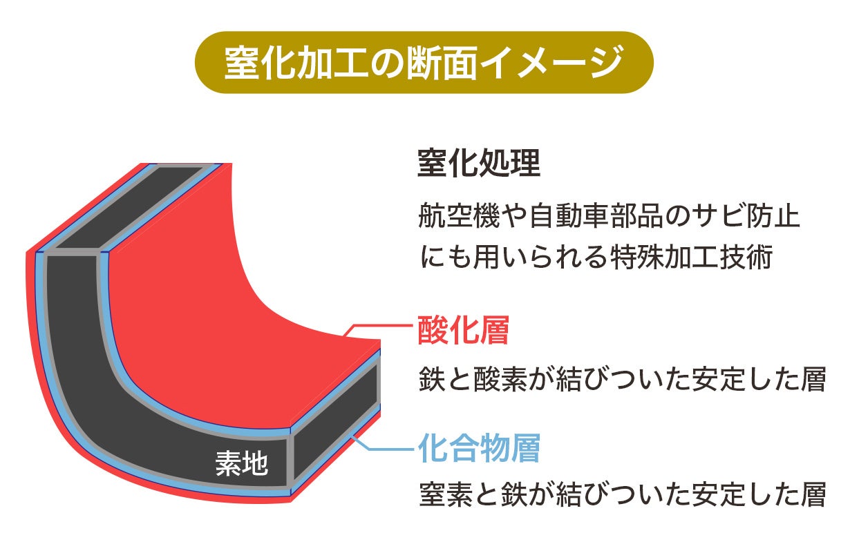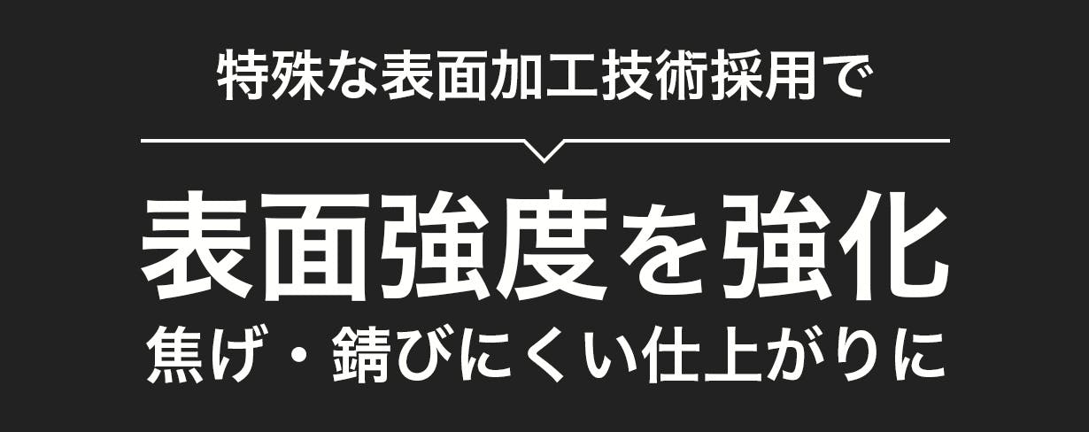 航空機や自動車部品のサビ防止にも用いられる窒化処理を施し、鋳鉄フライパンの表面強度を強化。