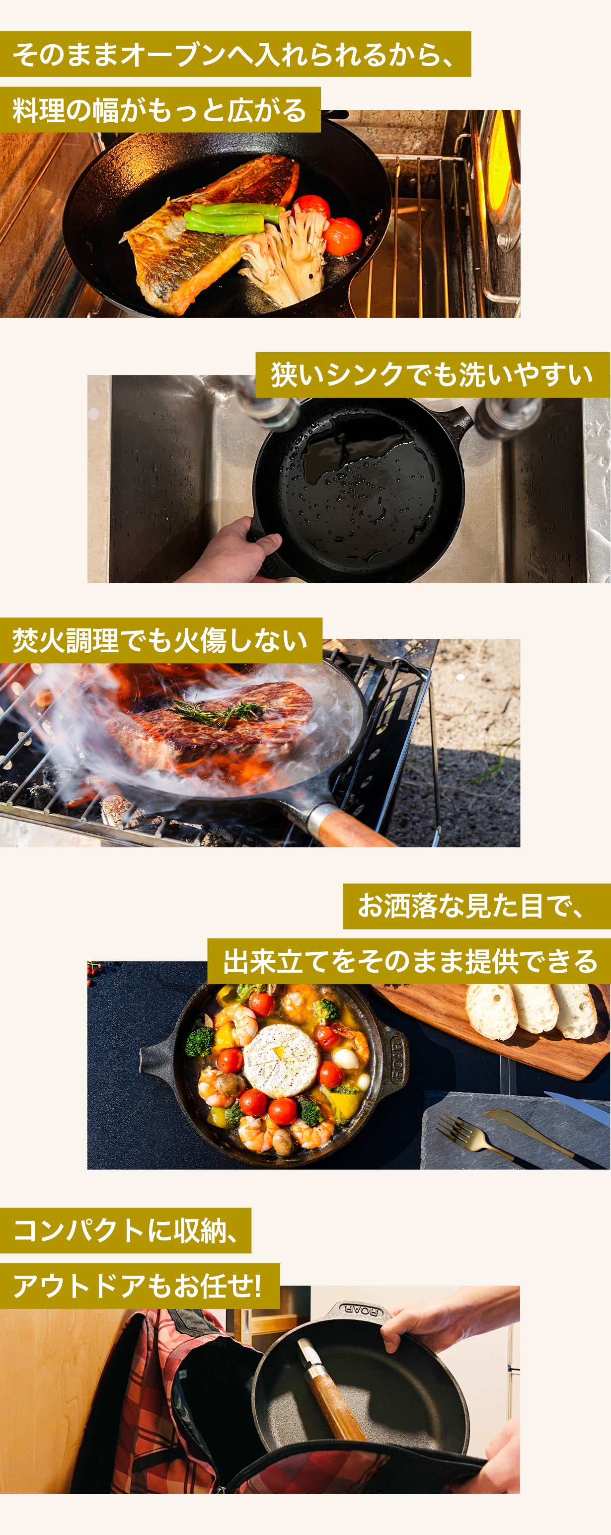 簡単なお手入れだけで、誰でも手軽に本格的な料理を楽しむことができるようになりました。また、どんな環境でも焼くだけで美味しく料理が作れるよう、収納や持ち運びを考慮して取っ手の取り外しが行えるような設計に。