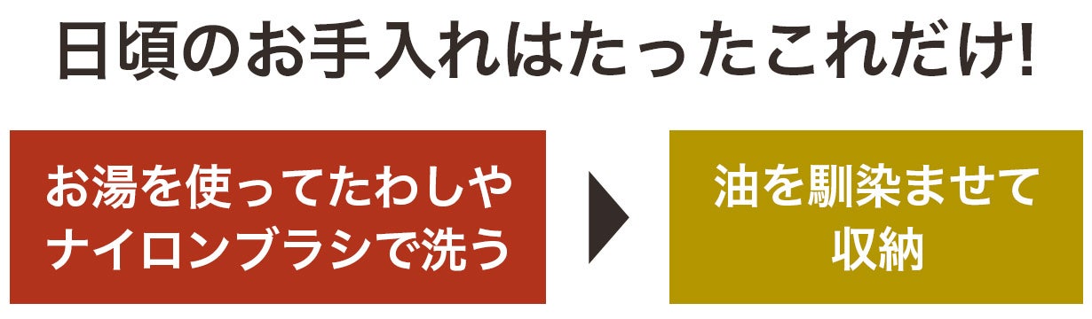 (食器用洗剤で洗うと馴染んだ油が落ちてしますのでお勧めしません。)